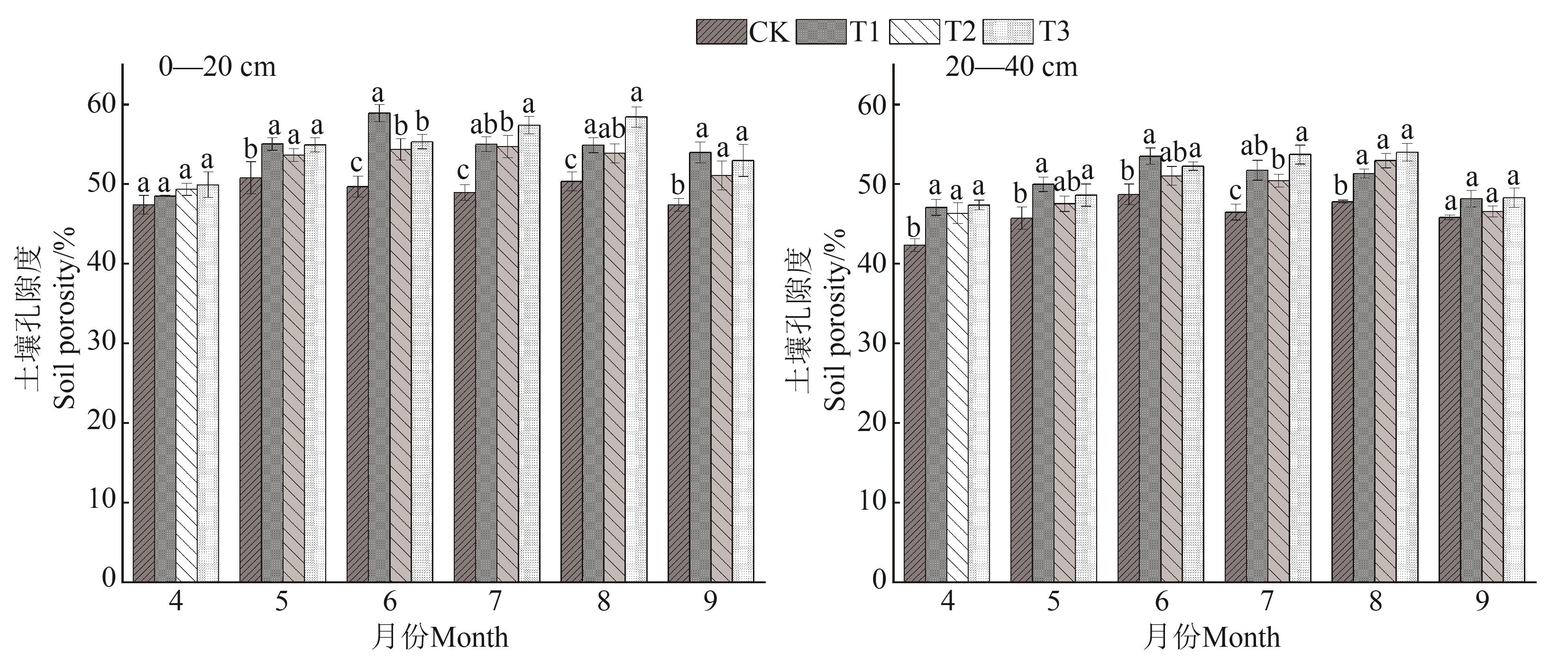 | 20—40 | CK | 74.36±03.02 c | 319.11±2.17 b | 54.22±3.02 c | 5.24±0.21 a | 3.53±0.93 a | 15.64±3.11 ab |