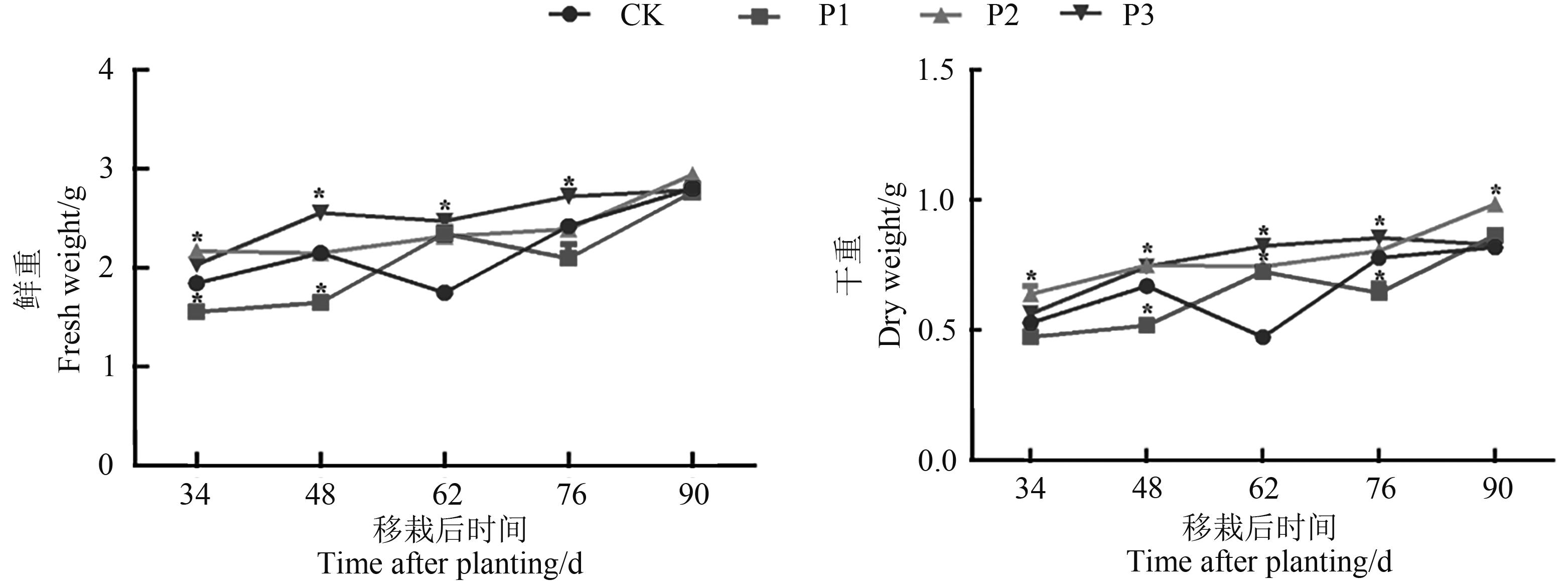 移栽后时间 Time after planting/d | 处理 Treatment | pH | 电导率 Electric conductivity/(μS·cm-1) | 碱解氮 Alkaline nitrogen/(mg·kg-1) | 速效钾 Available potassium/(mg·kg-1) | 有机质 Organic matter/% |