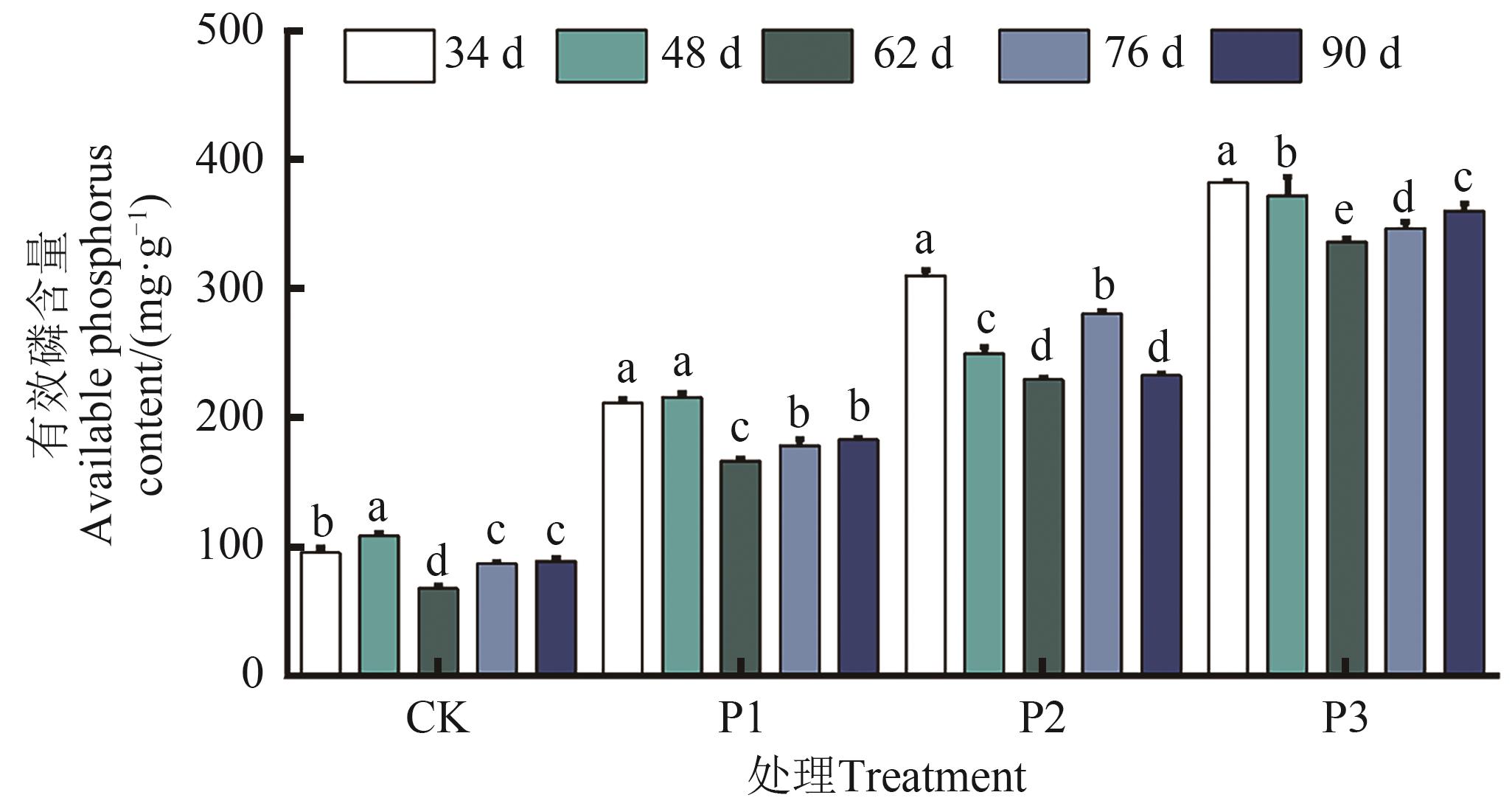 Fig. 3 Available phosphorus content in soil under different treatmentsNote:Different lowercase letters indicate significant differences between different treatments at P<0.05 level.