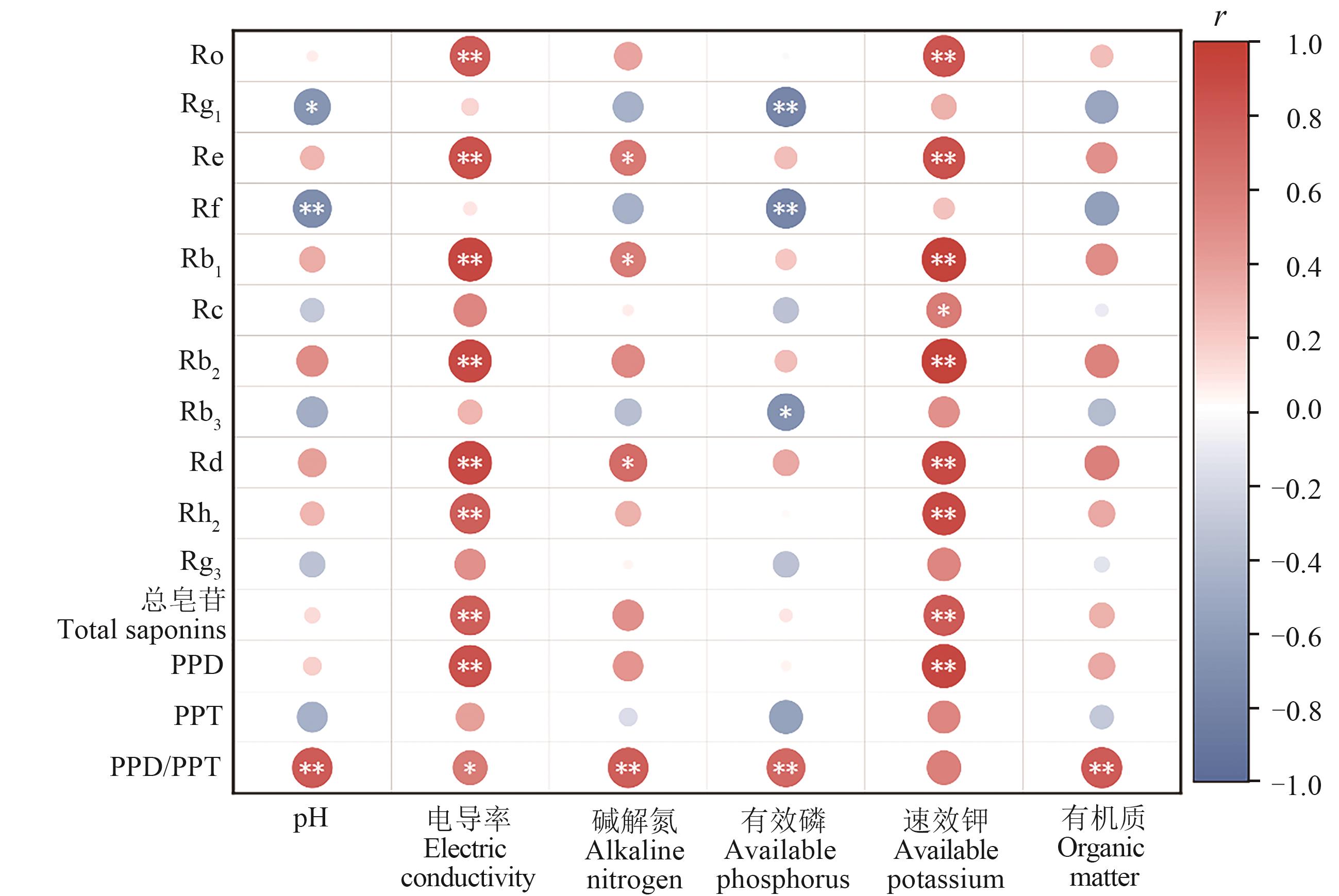 Fig. 5 Correlation analysis between ginsenoside content and soil physicochemical parameterNote:* and ** indicate significant correlations at P<0.05 and P<0.01 levels, respectively.