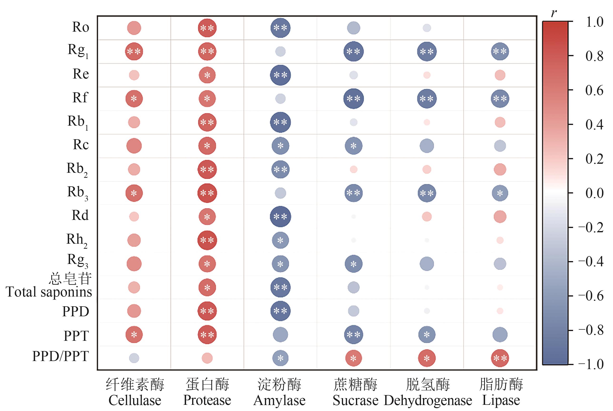 Fig. 6 Correlation analysis between ginsenoside content and soil enzymeNote:* and ** indicate significant correlations at P<0.05 and P<0.01 levels, respectively.