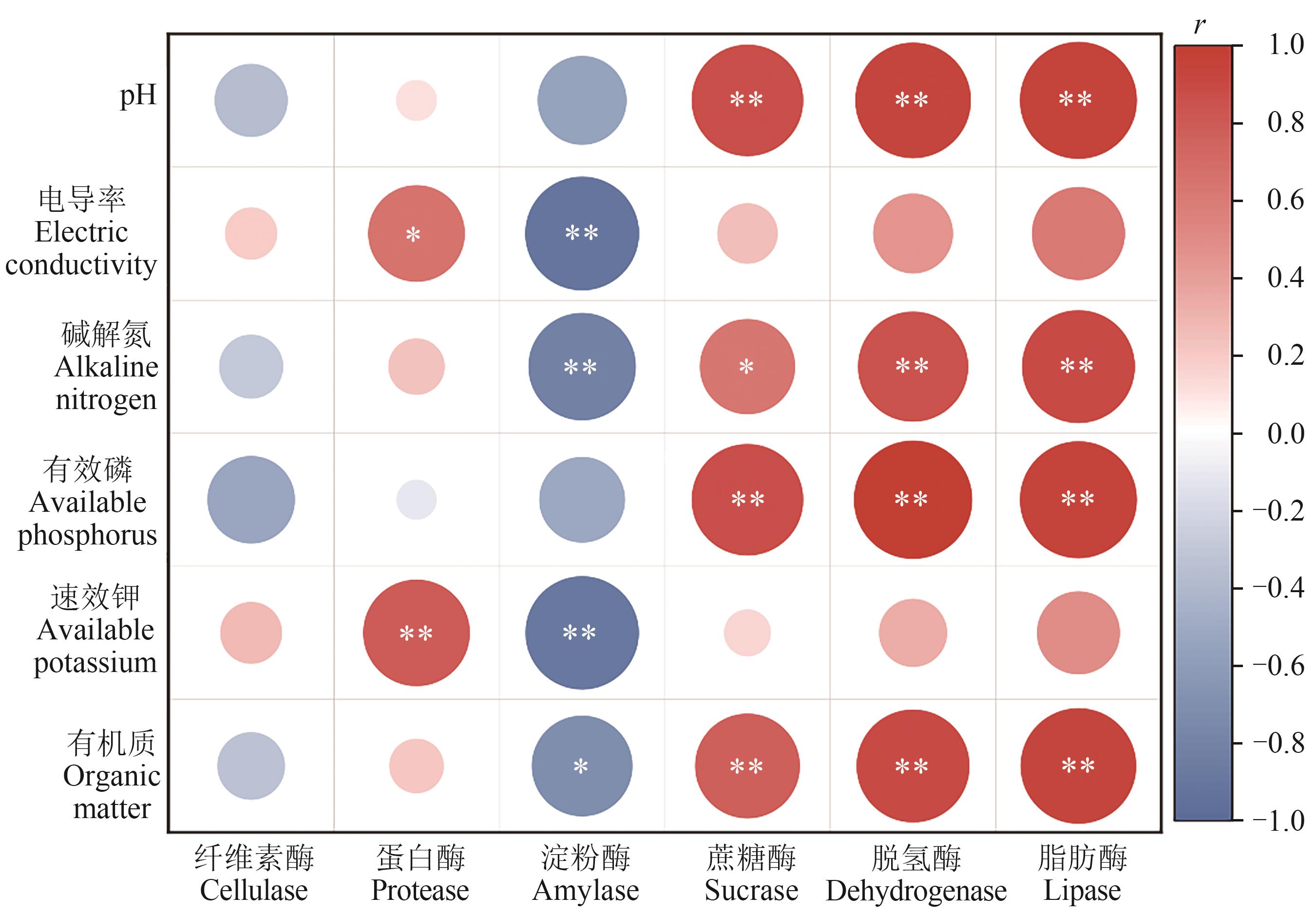 Fig. 7 Correlation analysis between soil physicochemical parameter and soil enzymeNote:* and ** indicate significant correlations at P<0.05 and P<0.01 levels, respectively.
