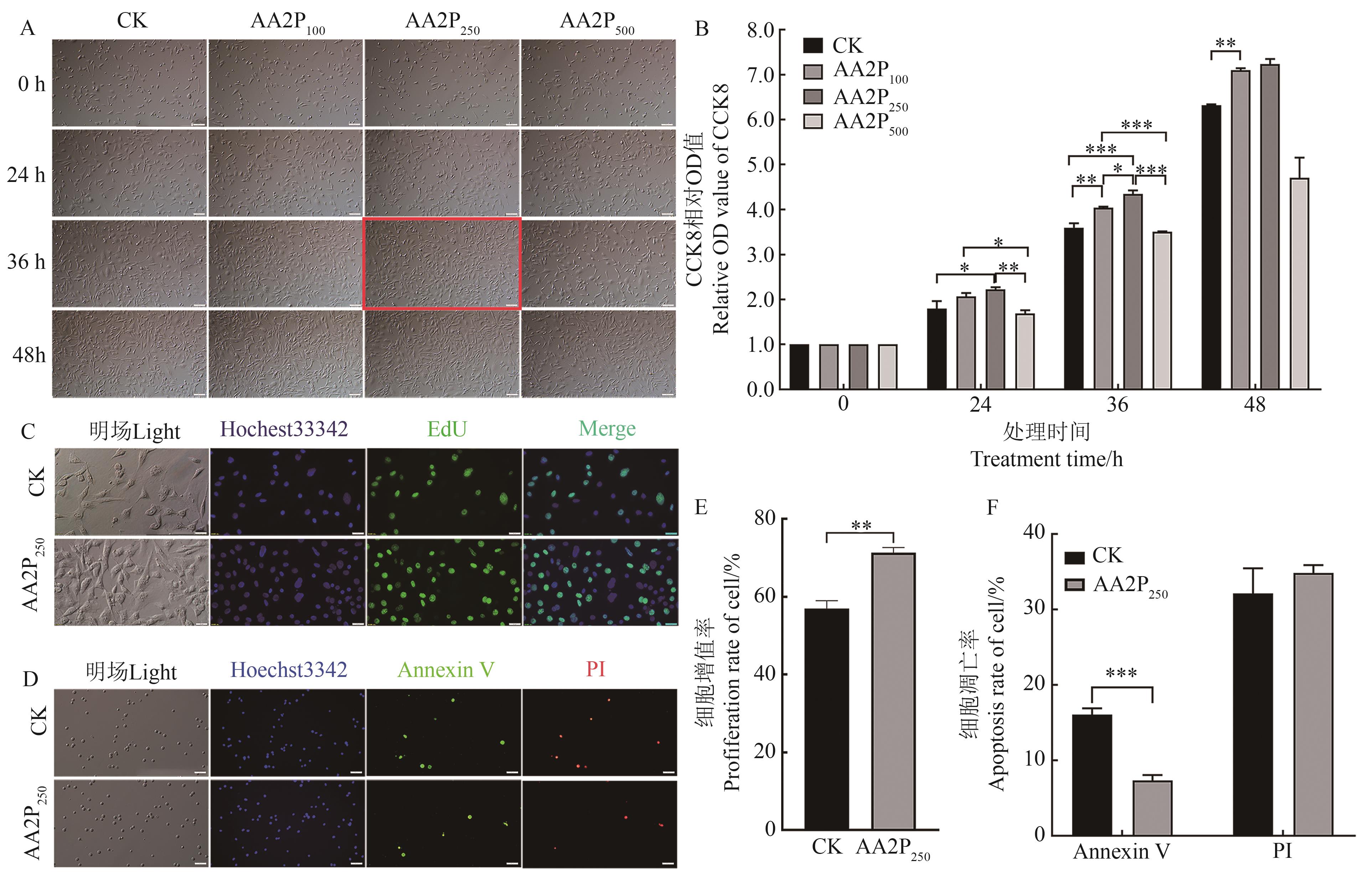 Fig. 1 Effects of AA2P on the viability, proliferation and apoptosis of mouse TM4 cellsA: Representative plots of TM4 cells treated with different AA2P treatments for different time with scale bar 100 μm; B: Cell viability; C: Representative images of EdU assay with scale bar 20 and 50 μm; D: Representative images of Annexin V assay with scale bar 50 μm; E: Proliferation rate of cell; F: Apoptosis rate of cell. *, ** and *** indicate significant differences at P<0.05, P<0.01 and P<0.001 levels, respectively