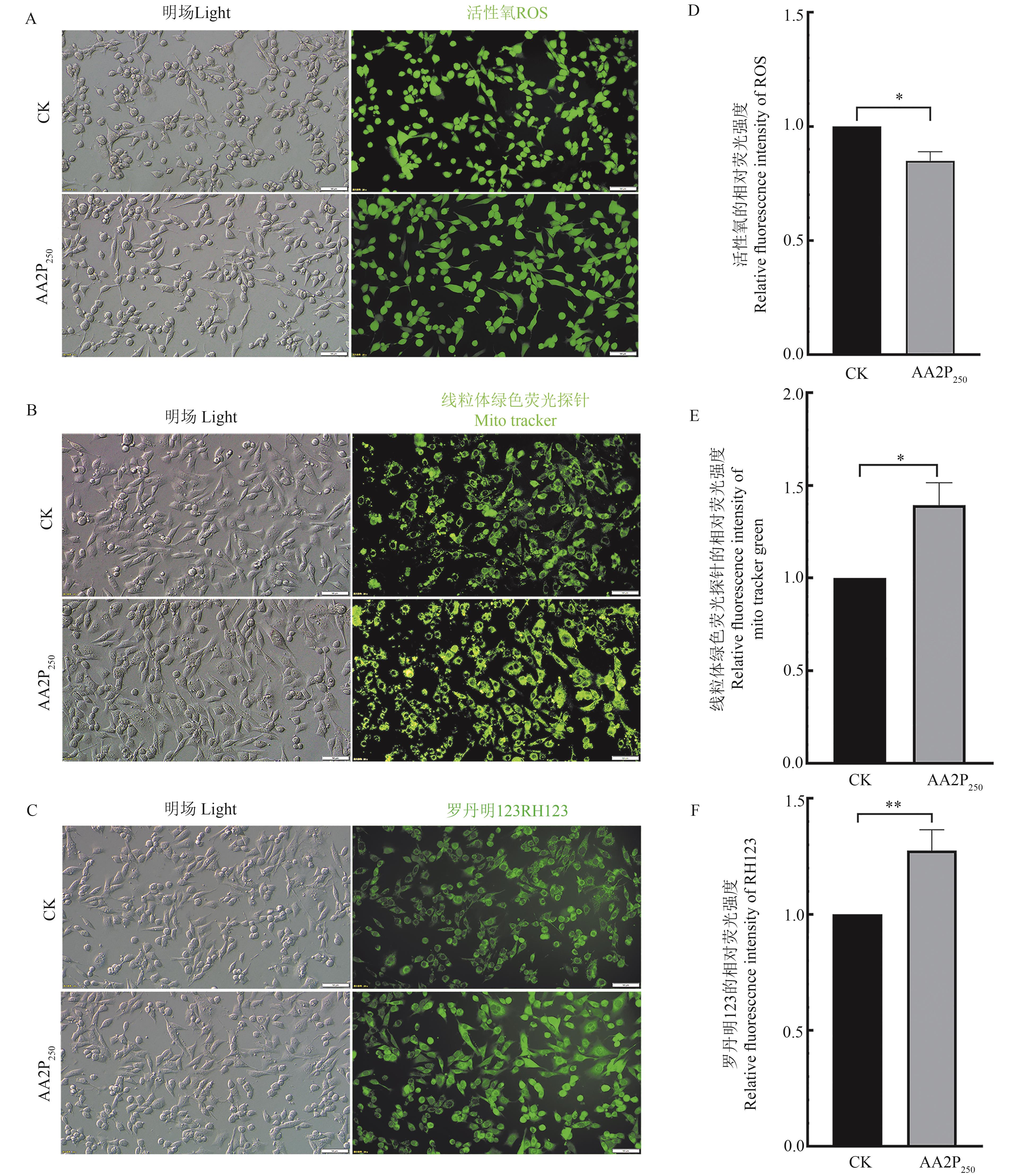 Fig. 2 ROS level and mitochondrial features of mouse TM4 cells treated by AA2PA~C: Representative images of ROS, MitoTracker and RH123 staining with scale bar 50 μm; D~F: Relative fluorescence intensities of ROS, MitoTracker and RH123 staining. * and ** indicate significant differences at P<0.05 and P<0.01 levels, respectively