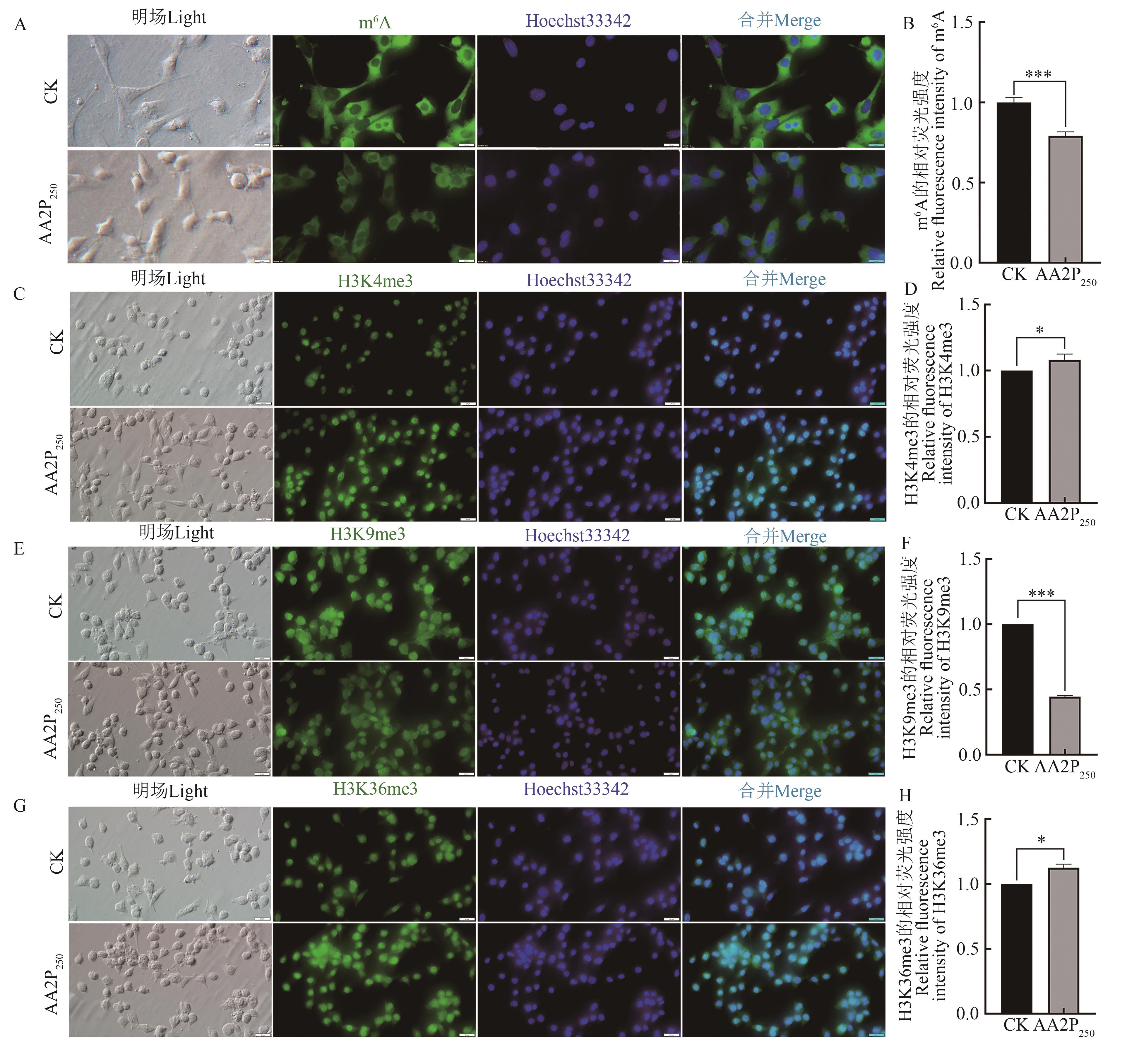 Fig. 3 Global levels of nucleic acid m6A methylation and histone H3 trimethylation at sites of lysine 4, 9 and 36 in mouse TM4 cells treated by AA2PA, C, E, G: Immunofluorescence staining represents images with scale bar 20 μm; B, D, F, H: Histogram of relative fluorescence intensity. * and ** indicate significant differences at P<0.05 and P<0.001 levels, respectively