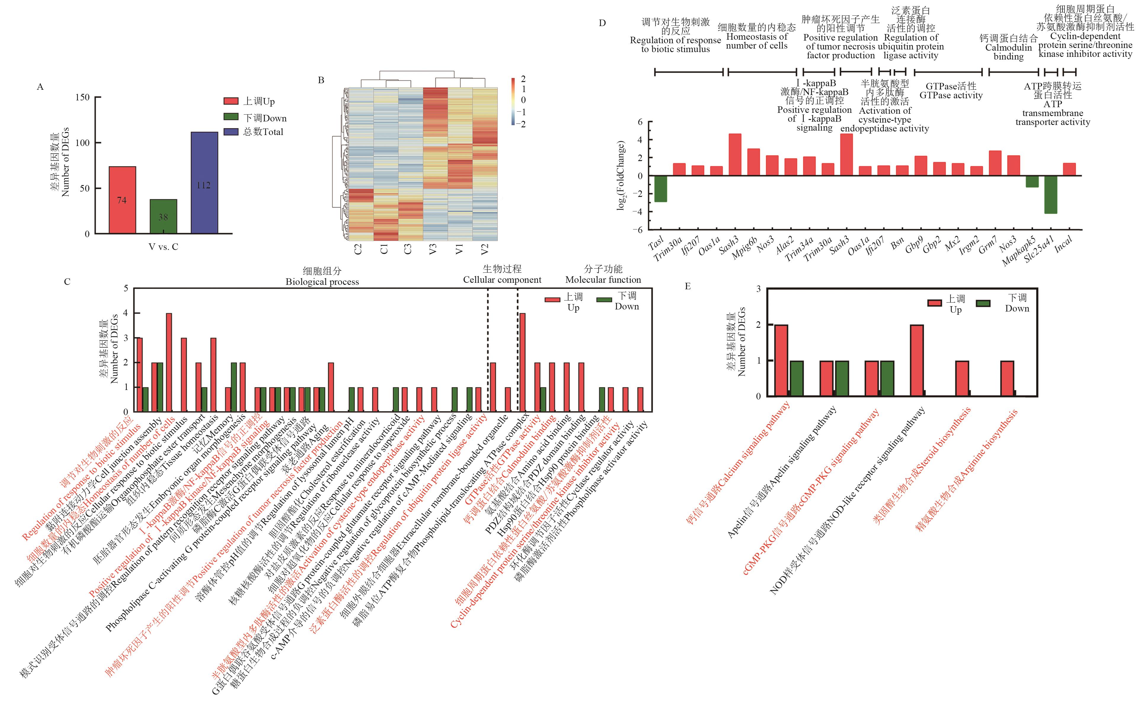 Fig. 5 RNA-seq identified genes and molecular pathways altered by AA2P treatment of mouse TM4 cellsA: Number of DEGs; B: Heatmap of DEGs; C: Significantly enriched GO term; D: Partial DEGs involved in some key GO terms; E: Significantly enriched KEGG signaling pathways