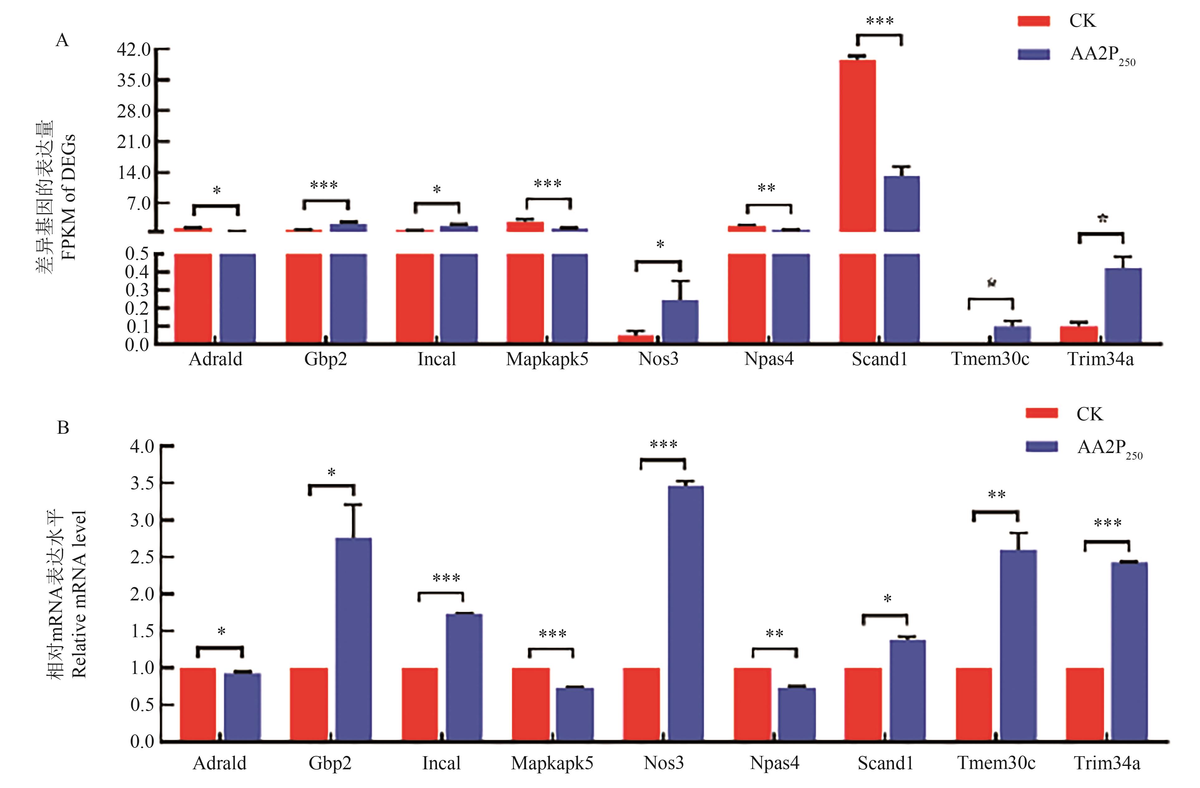 Fig. 6 Validation of selected DEGsA: Expression and difference of DEGs as detected by RNA-seq; B: Validation of expression and difference of DEGs by RT-qPCR. *, ** and *** indicate significant differences at P<0.05, P<0.01 and P<0.001 levels, respectively