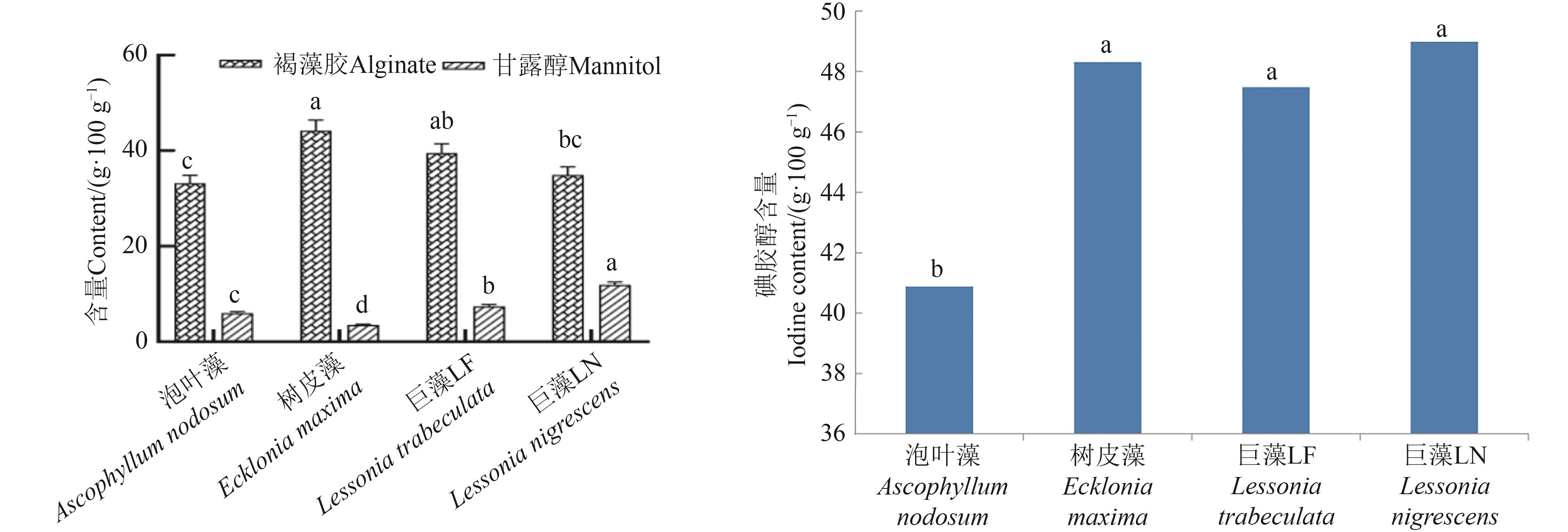 为分析泡叶藻(Ascophyllum nodosum)、树皮藻(Ecklonia maxima)及巨藻Lessonia trabeculata(LF)和Lessonia nigrescens(LN)的营养价值,进一步挖掘其加工利用潜力,对这4种大型褐藻的基本营养成分、氨基酸、脂肪酸、无机元素进行测定与评价。结果表明,4种大型褐藻均为高蛋白、低脂肪、高膳食纤维的藻类,其中树皮藻中不溶性膳食纤维含量高达48.60%。巨藻LN、树皮藻、巨藻LF 、泡叶藻中的碘胶醇含量分别为48.99、48.31、47.48、40.88 g·100 g-1;4种褐藻均含有18种氨基酸,其中包含8种必需氨基酸,氨基酸评分高于国际粮农组织/世界卫生组织标准,表明4种褐藻的氨基酸组成合理、分布均衡;通过必需氨基酸指数得出,巨藻LN具有更高的营养价值,其饱和脂肪酸占总脂肪酸的比例较高,且不饱和脂肪酸含量较高。4种褐藻均富含Na、K、Ca、Fe、Zn等无机元素。除泡叶藻中的Pb元素超出限定范围外,其余重金属元素含量均在限量范围以内。综上,4种褐藻具有较高营养价值,在海藻化工和营养保健食品开发方面均具有较大利用潜力。