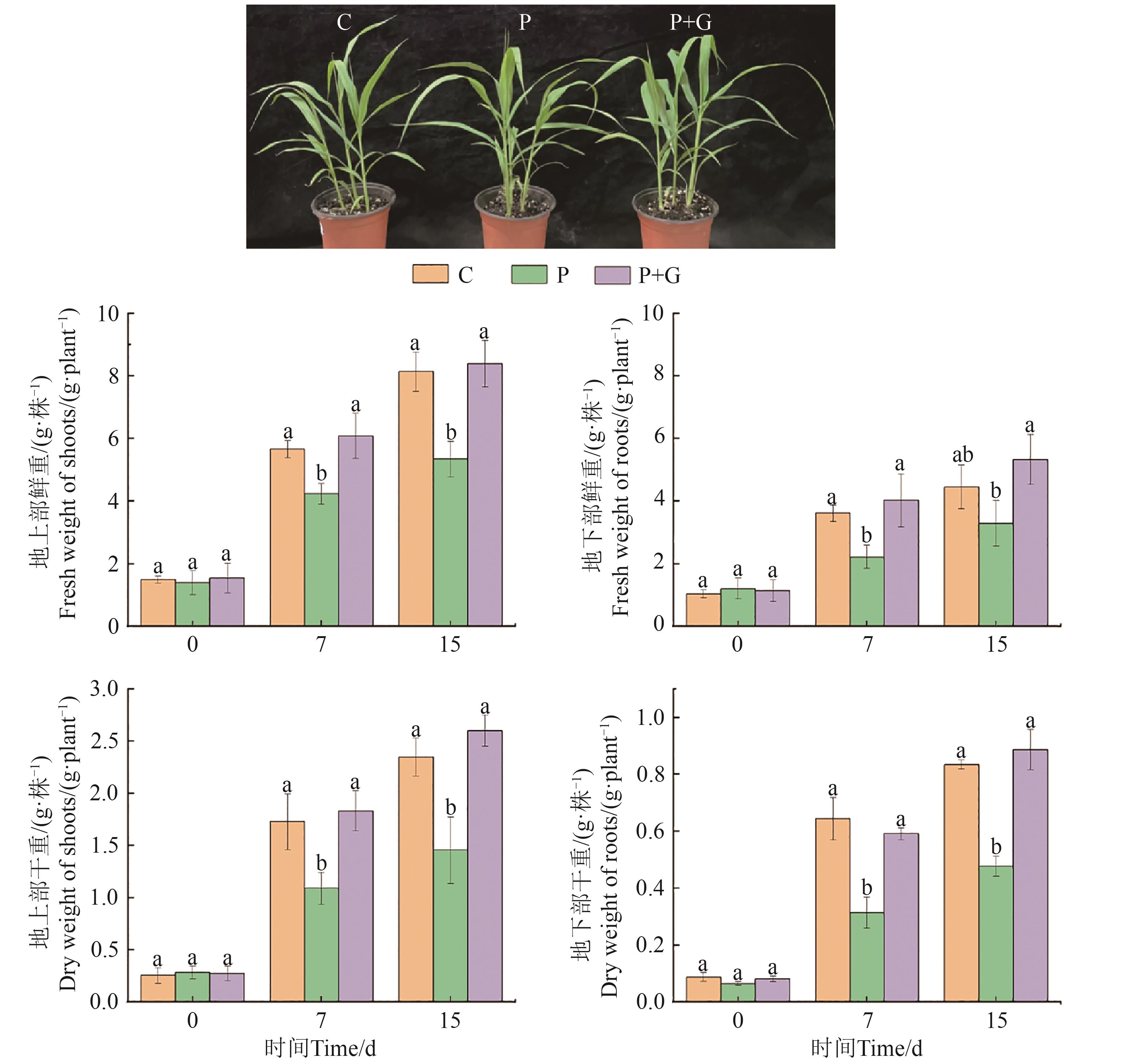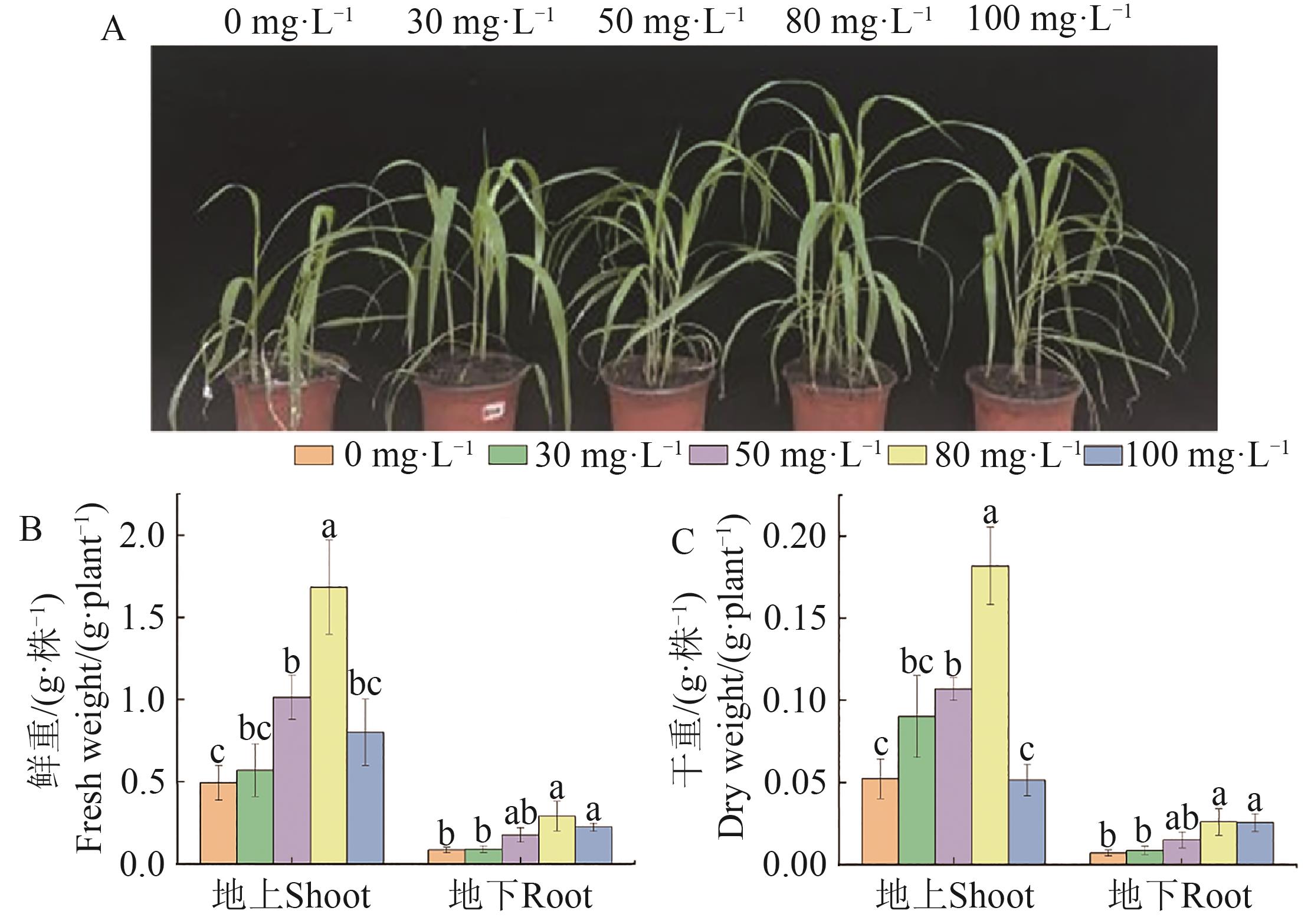 Fig. 2 Seedling phenotype and fresh weigh, dry weight of shoots and roots of foxtail millet under different treatmentsNote:Different lowercase letters indicate significant differences between different treatments of same time at P<0.05 level.