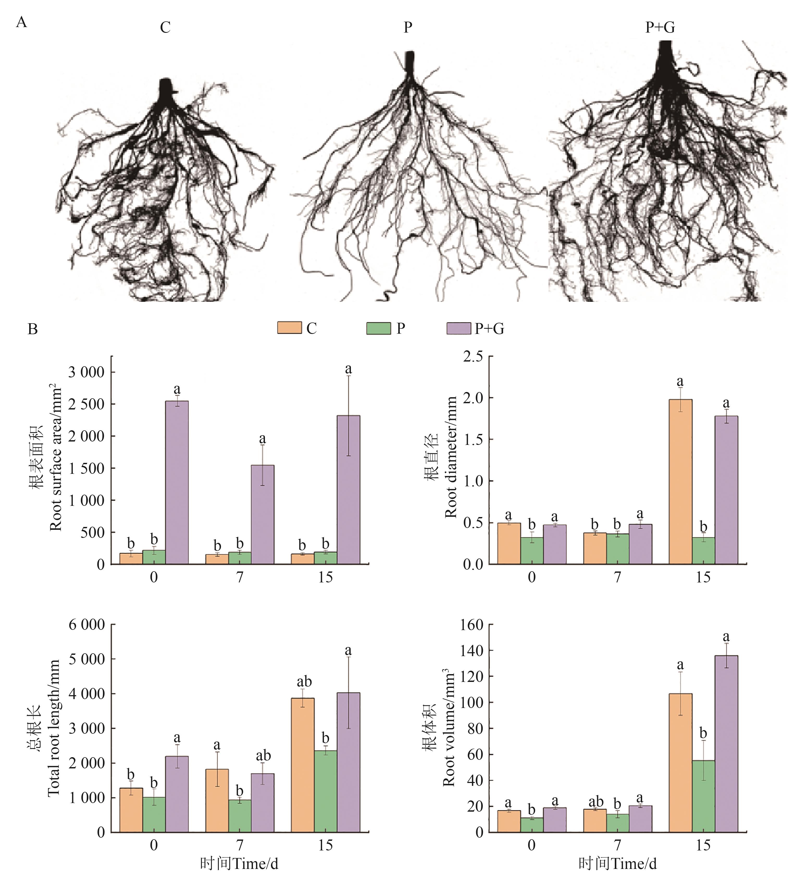 Fig. 3 Root phenotype and indexes of foxtail millet under different treatmentsA: Root phenotype; B: Root undexes; different lowercase letters indicate significant differences between different treatments of same time at P<0.05 level