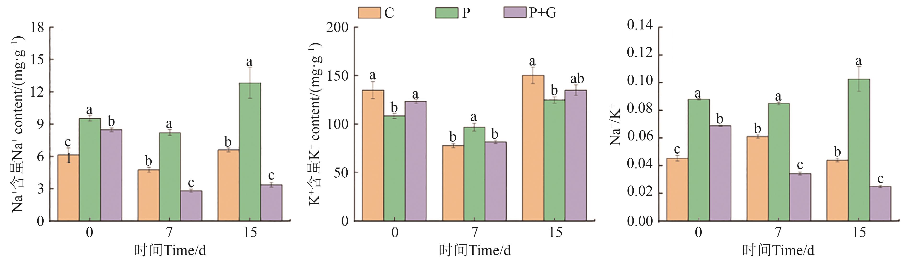 Fig. 5 Na+, K+ contents and Na+/K+ under different treatmentsNote:Different lowercase letters indicate significant differences between different treatments at P<0.05 level.