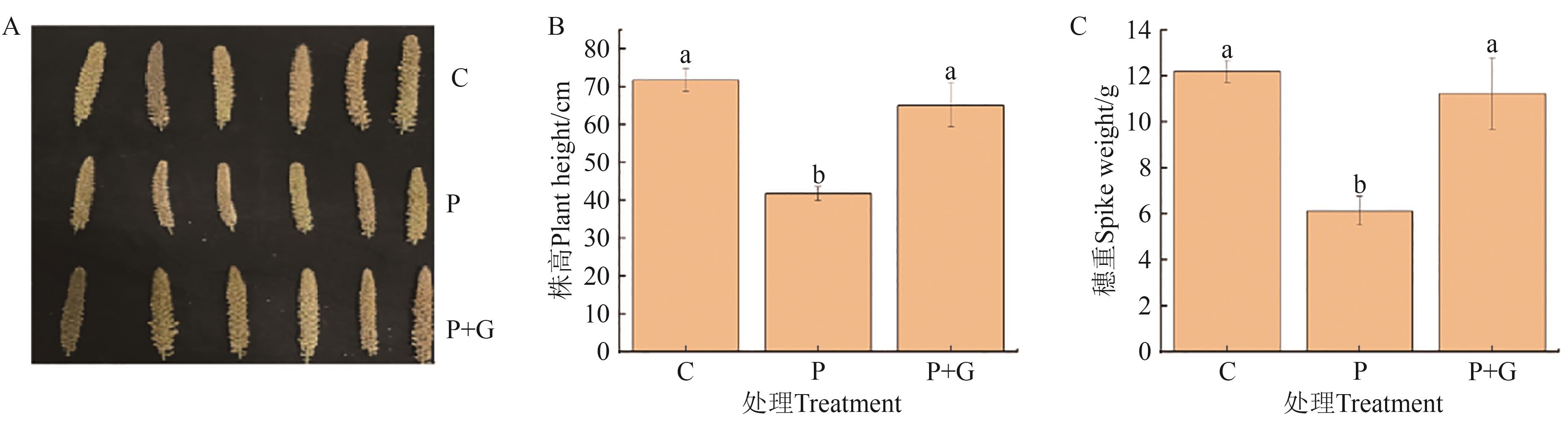 Fig. 6 Phenotype, plant height and ear weight of foxtail millet under different treatmentsA: Phenotype of foxtail millet; B: Plant height; C: Ear weight; different lowercase letters indicates significant differences between different treamtents at P<0.05 level