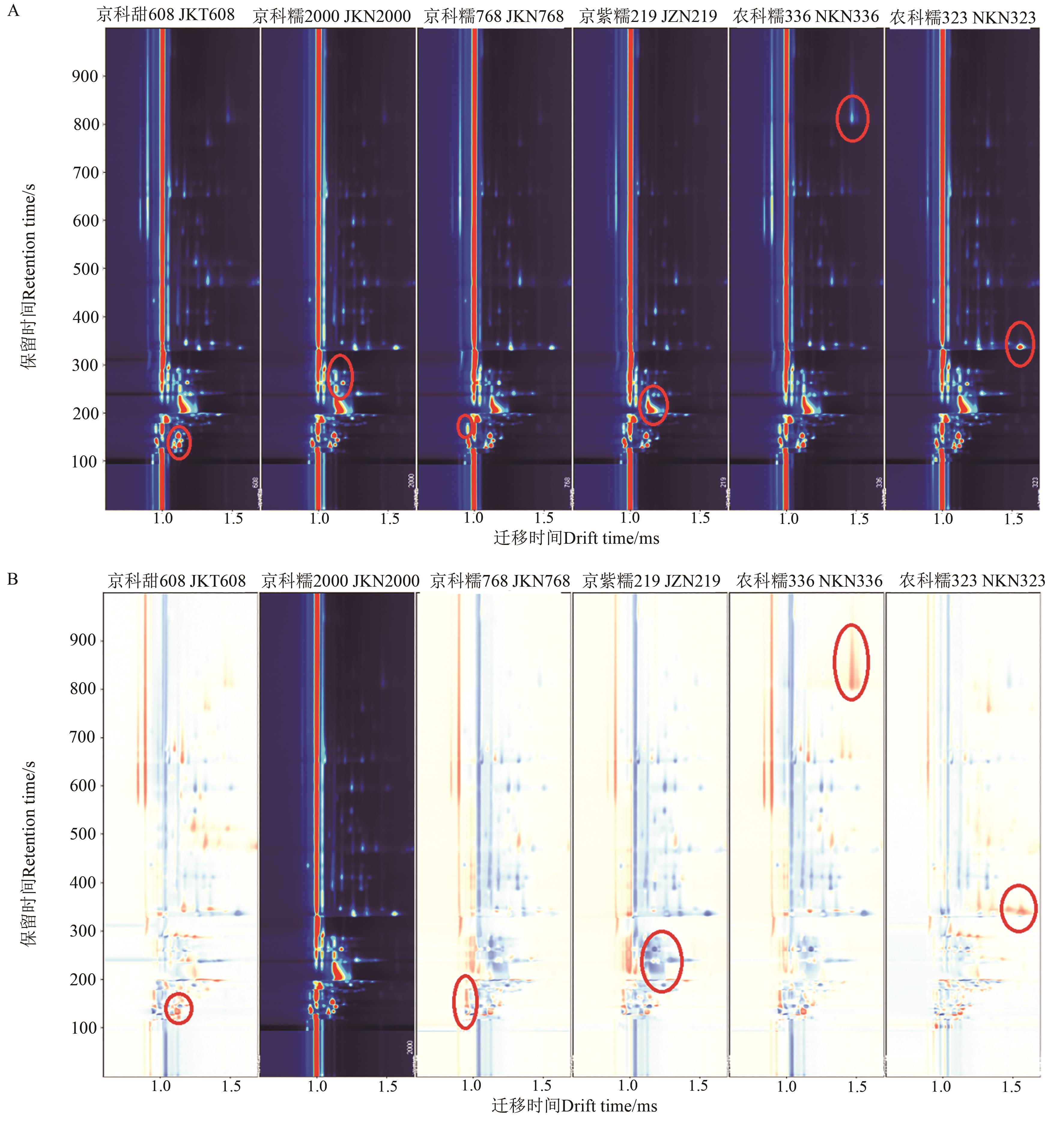 Fig. 2 Top view and difference comparison diagram of GC-IMS of the tested fresh corn varietiesA: Top view; B: Difference comparision. The abscissa represents the relative migration time, the ordinate represents the retention time (s) of gas chromatography, the red vertical line at abscissa 1.0 represents the RIP peak, each point on both sides of the peak represents a volatile flavor compound, the color represents the intensity of the substance peak, from blue to red, and the darker the color, the greater the peak intensity.
