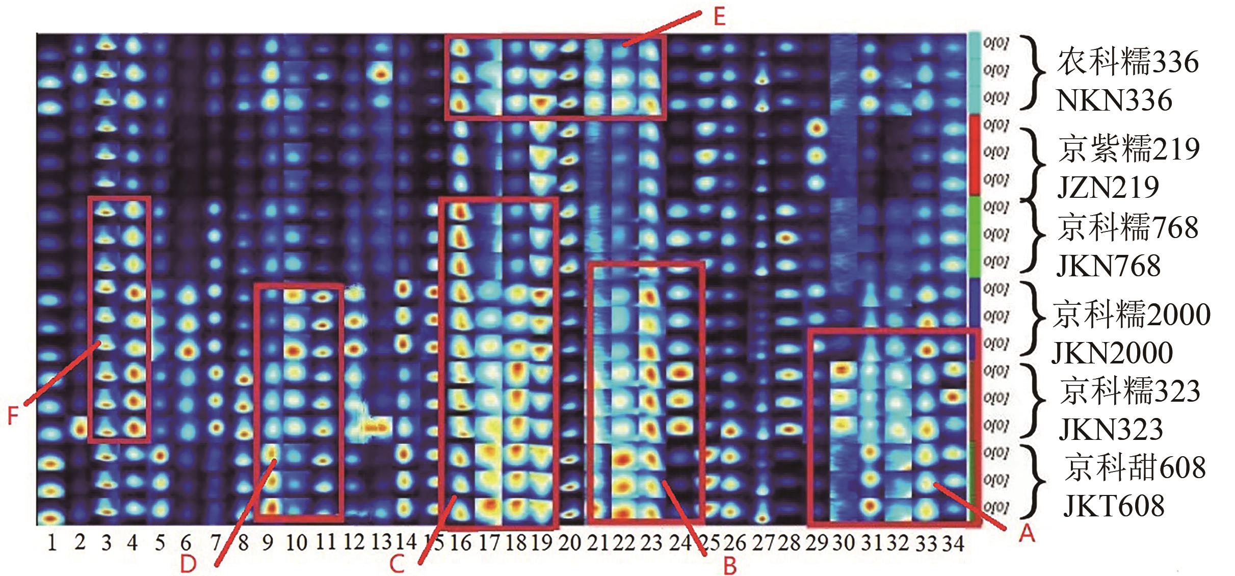 Fig. 3 Fingerprint of volatile flavor compounds in fresh cornNote:In the figure, the rows represent all selected signal peaks in the sample, the columns represent the signal peaks of the same volatile flavor compound in different samples, and the color intensity represents the content level. Boxes A to F represent alcohols, aldehydes, ketones, esters & aldehydes, and other aromatic compounds, respectively.1—Ethyl acetate(D); 2—2-methylpyrazine(D); 3—1-heptene; 4—butyl ether; 5—diethyl disulfide; 6—2-methylpyridine; 7—Heptan-2-one; 8—Octan-2-one; 9—3-Heptanone; 10—Butan-2-one; 11—3-octanone; 12—Ethyl pentanoate; 13—Ethyl pyruvate; 14—Isoamyl acetate; 15—Ethyl butyrate; 16—Isoamyl formate; 17—Butyl butanoate; 18—Methy 3-methylbutanoate; 19—Methyl propionate; 20—Methyl acetate(D); 21—(E)-2-hexenal; 22—2-methylbutanal; 23—Butanal; 24—Hexanal; 25—3-methylbutanal; 26—Heptanal(D); 27—2-Hexenal; 28—Pentanal; 29—1-butanol(D); 30—3-Methyl-1-butanol; 31—2-methyl-1-propanol(D); 32—2-Hexanol; 33—Pentan-2-ol; 34—Phenylmethanol.