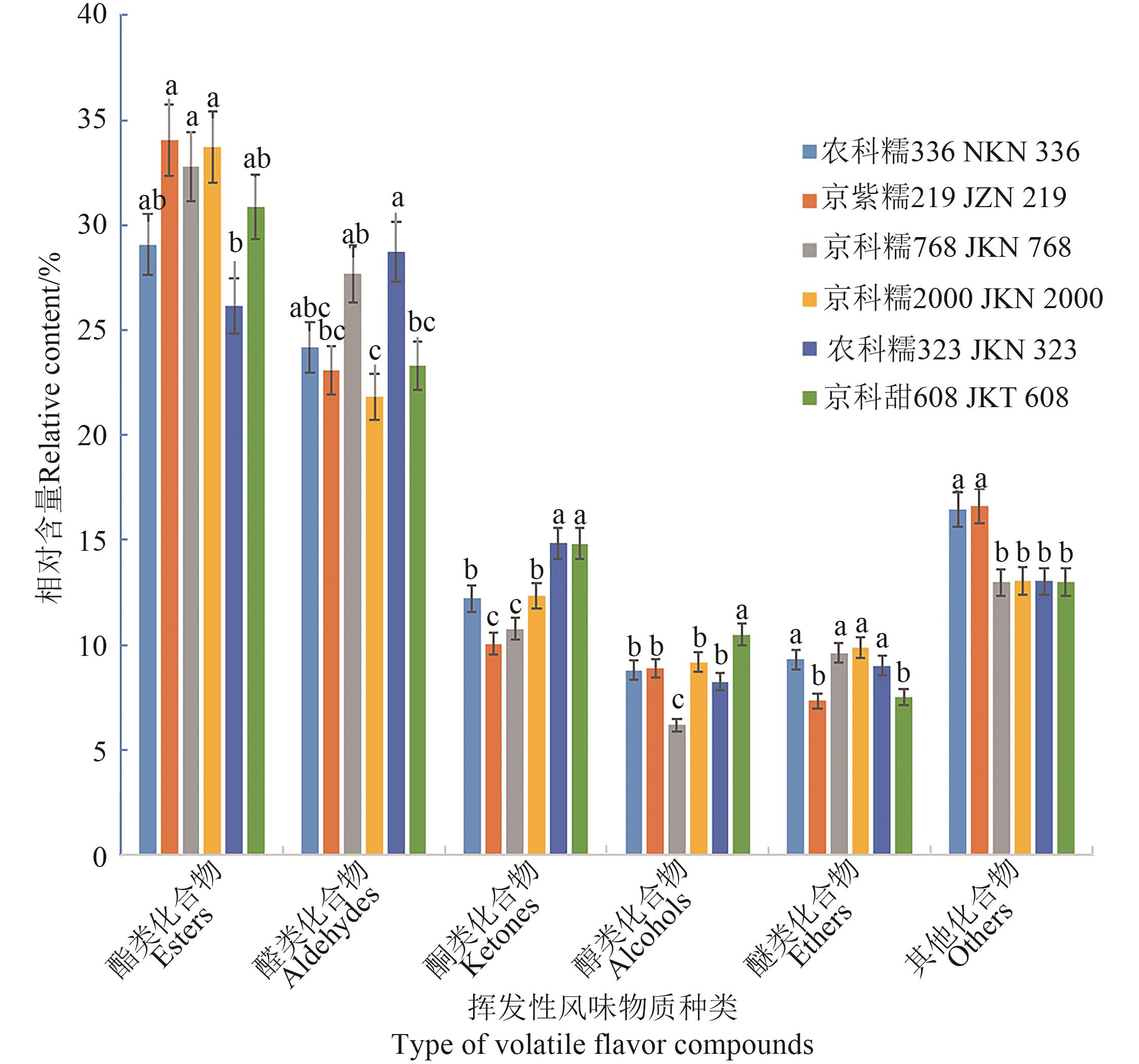 Fig. 4 Relative content of volatile compounds in fresh cornNote: Different small letters indicate significant differences between different treatments at P<0.05 level.