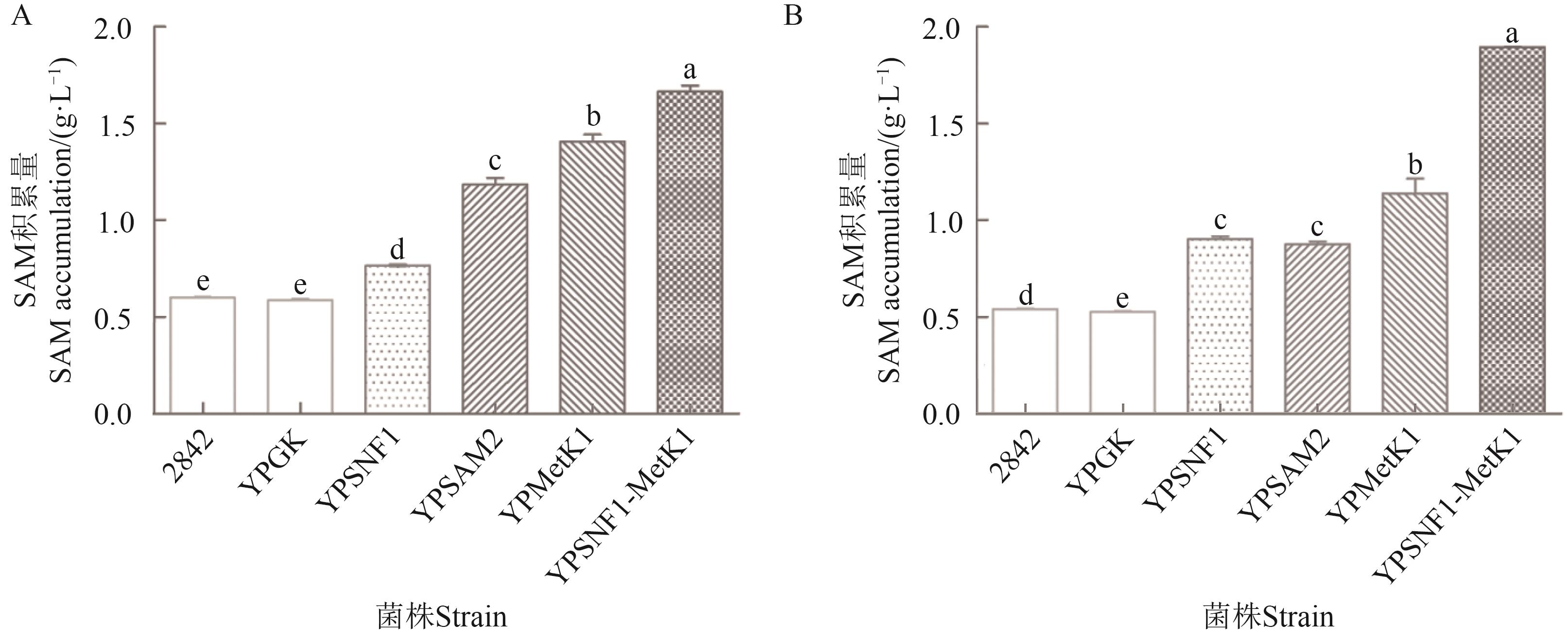 S-adenosyl-L-methionine (SAM) is an important bioactive molecule in all living organisms. Regulating the glucose effect of Saccharomyces cerevisiae and directing the carbon flux to SAM synthesis is a challenge for cell factory. The regulating glucose effect by overexpressing SNF1 and introducing SAM synthase gene MetK1 of Leishmania infantum were applied to improve SAM production in S. cerevisiae CGMCC 2842 (2842). The results showed that the overexpression of SNF1 enhanced the expression levels of genes involved in glucose transport and glycolysis, which improved the glucose utilization and then elevated the levels of glycolytic intermediates. The expression levels of ACS1 and ALD6 and the activity of alcohol dehydrogenase 2 (ADH2) were enhanced, which probably promoted the conversion of ethanol in fermentation broth into acetyl-CoA. The gene expressions involved in sulfur-containing amino acids were also enhanced for the precursor amino acid biosynthesis. Finally, the introduction of MetK1 of L. infantum effectively directed the carbon metabolism flux to SAM synthesis. The SAM production of the stain YPSNF1-MetK1 reached 1.90 g·L-1,increased by 251.85% compared to that of 2842. Above results laid theoretical foundation for the regulation and application of glucose effect in yeast.