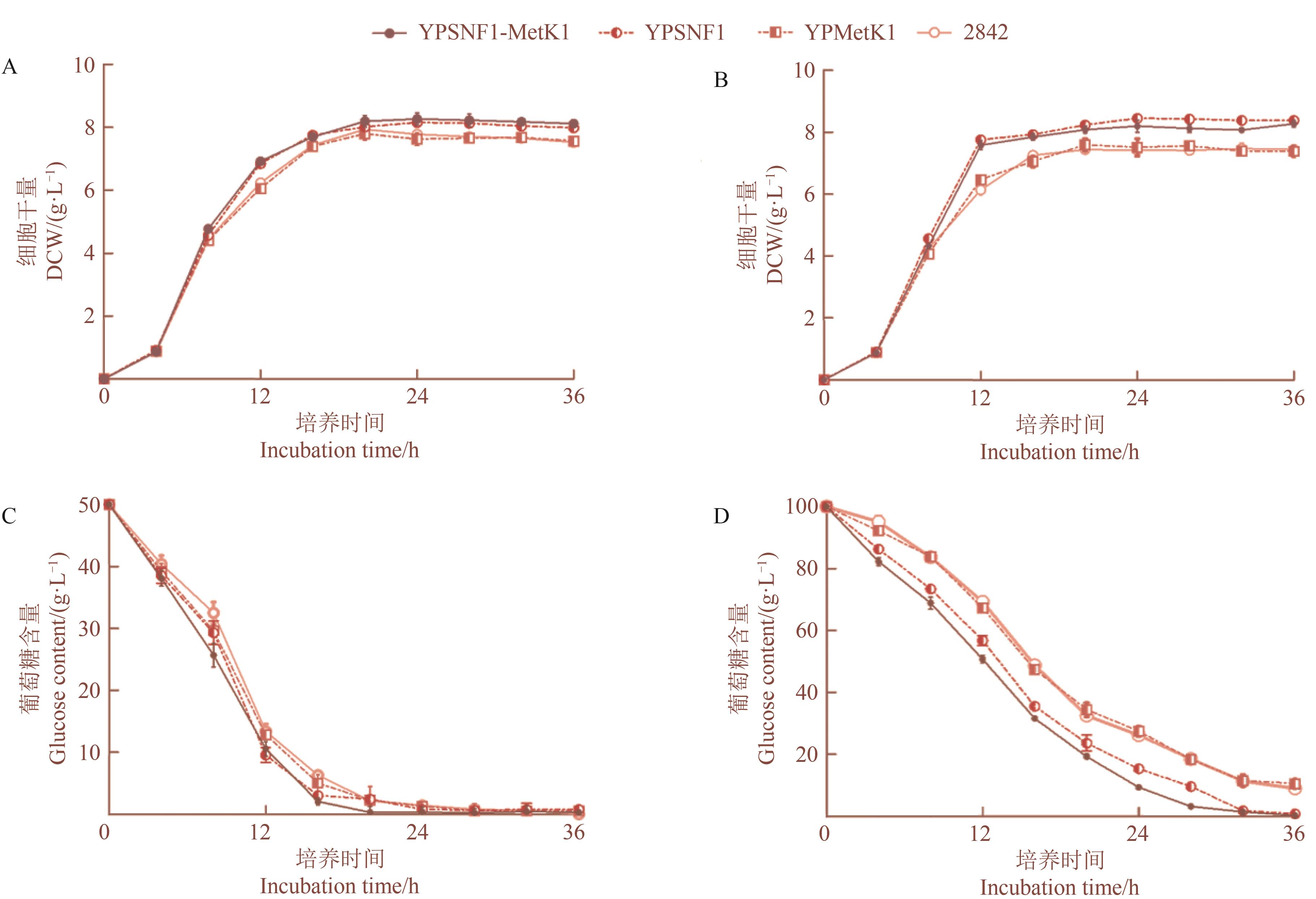 S-腺苷-L-甲硫氨酸(S-adenosyl-L-methionine,SAM)是生物体内重要的生理活性物质。通过调控酿酒酵母的葡萄糖效应而将碳通量定向到SAM合成是细胞工厂的挑战。以酿酒酵母CGMCC 2842(2842)为出发菌,过表达SNF1基因调控葡萄糖效应并引入利士曼原虫(Leishmania infantum)SAM合成酶基因MetK1。结果发现,SNF1过表达可提高糖酵解相关基因表达水平和葡萄糖利用率,进而改善糖酵解中间体水平;提高ACS1ALD6表达及乙醇脱氢酶2(alcoholdehy drogenase 2,ADH2)活性,可促进发酵液中的乙醇转化为乙酰辅酶A;还增强了SAM前体氨基酸及含硫氨基酸代谢相关基因表达水平。异源MetK1引入可有效定向碳代谢到SAM合成。重组菌YPSNF1-MetK1菌株的SAM产量达1.90 g·L-1,较出发菌株2842产量提高251.85%。以上研究结果为酵母葡萄糖效应调控及其应用奠定理论基础。