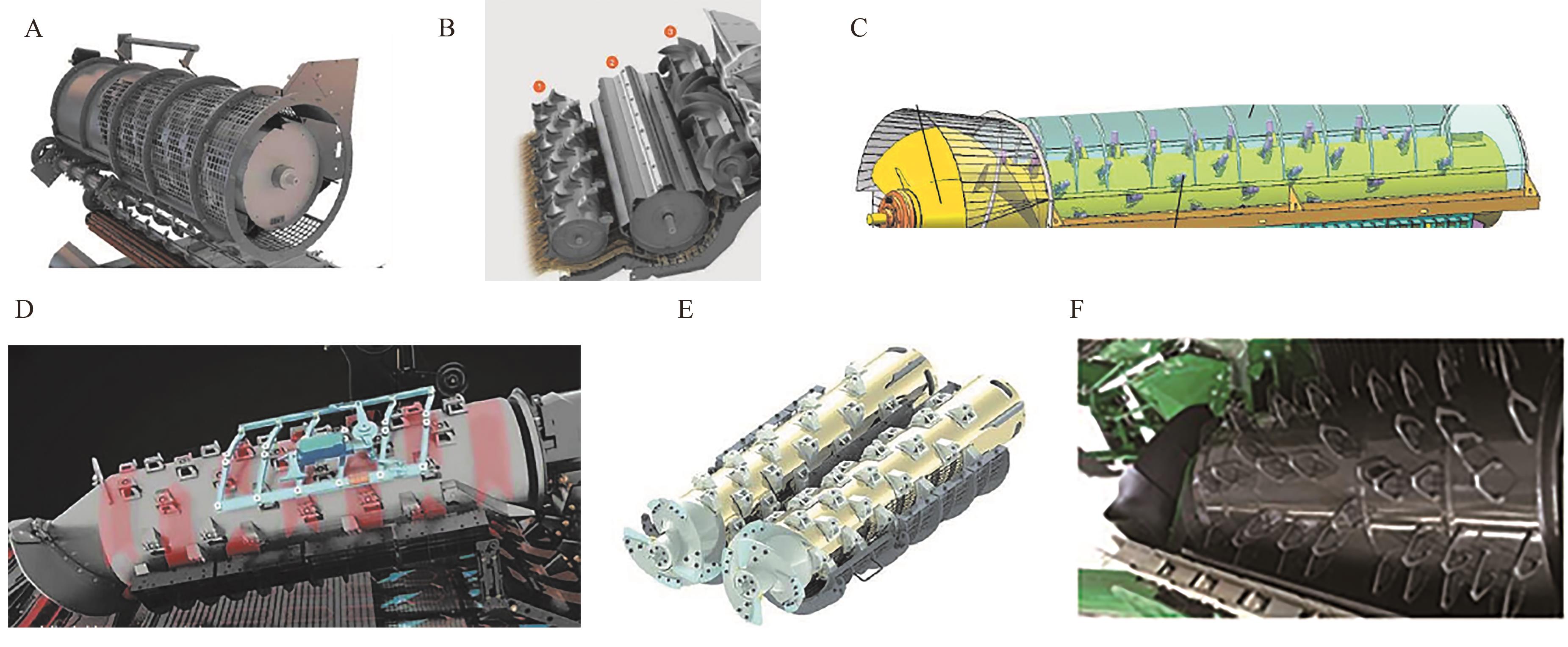 Fig. 3 Types of full feeding and half feeding threshing devices[9,21]A: Axial-flow drum type; B: Tangential-flow drum type; C: Spike-tooth drum type; D: Rasp-bar drum type; E: Double-drum type; F: Arc-tooth drum type