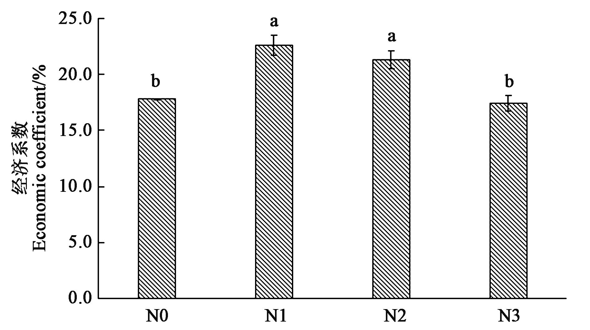 Fig. 1 Economic coefficient of sesame under different nitrogen treatmentsNote:Different lowercase letters indicate significant differences between different treatments at P<0.05 level.