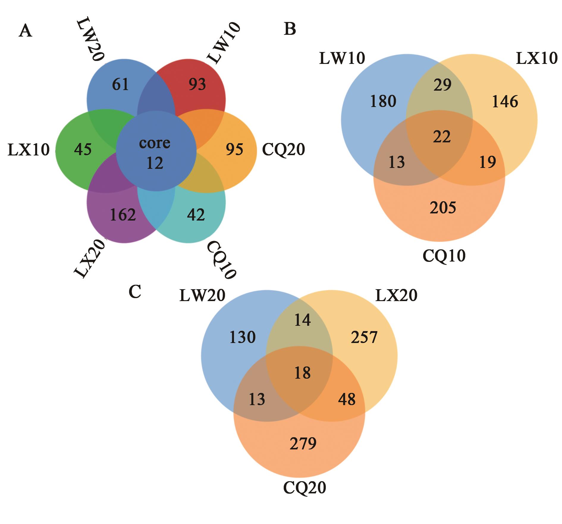 Fig. 1 Veen diagram of rhizosphere soil samples of Cynanchum bungei DecneA: 6 sample groups; B: Sample group underground 10 cm; C: Sample group underground 20 cm