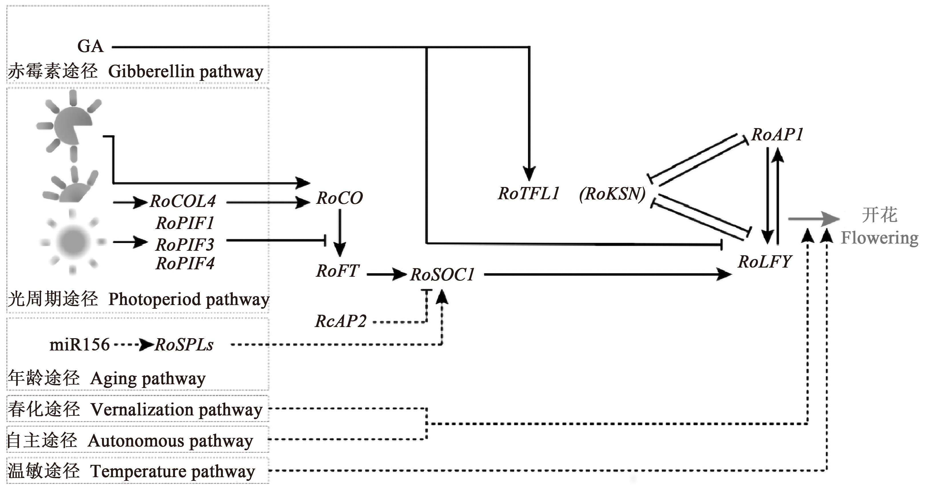 Fig. 1 Schematic diagram of flowering regulation pathway of roseNote: Arrow represents promotion; passivation line represents inhibition; dotted line represents regulation with phenomenon but unclear mechanism.