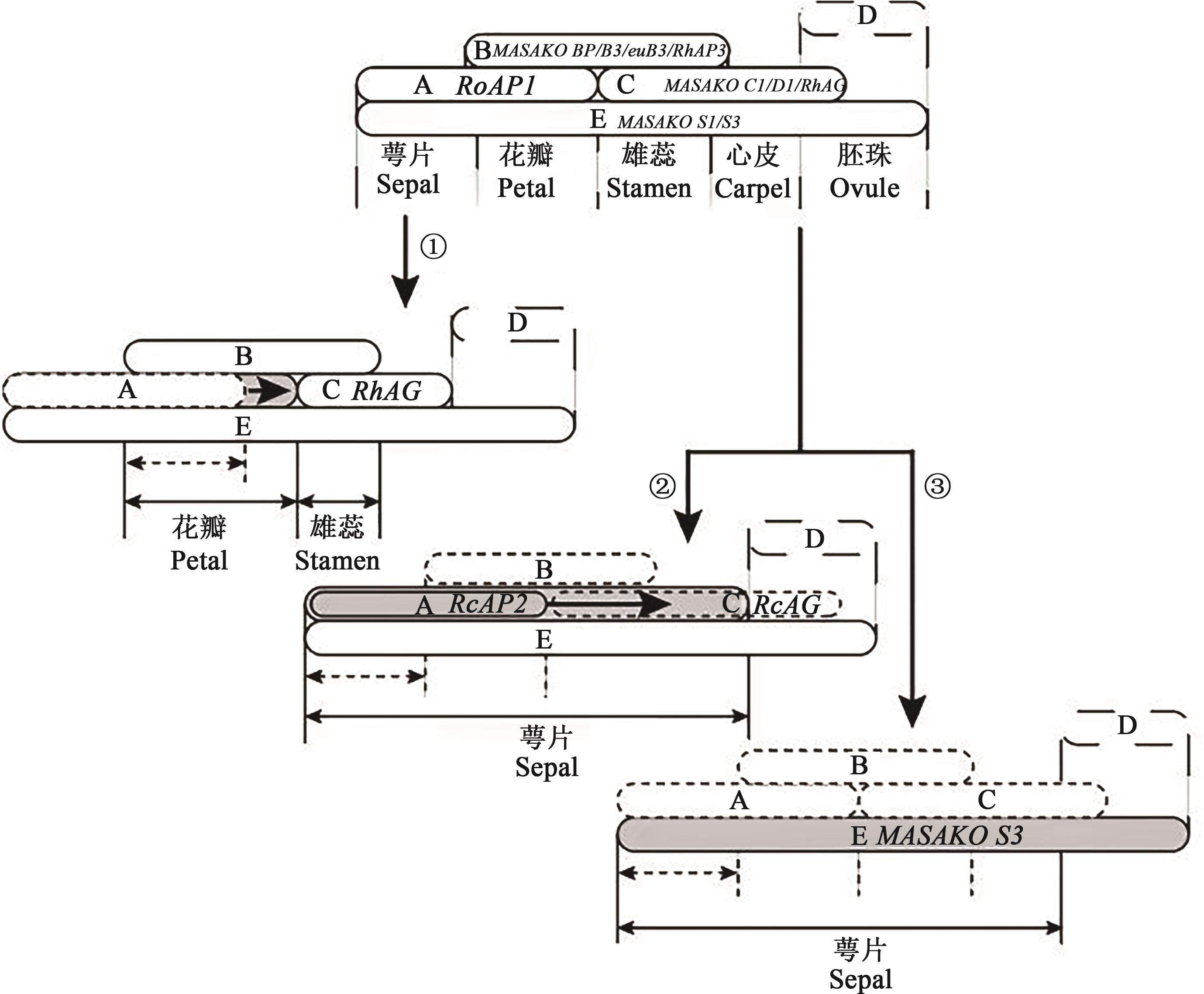 Fig. 2 ABCDE model of organ development in roseNote: ①—Schematic diagram of “double valve” model; ②—Schematic diagram of ‘Viridiflora’ hypothesis (1); ③—Schematic diagram of ‘Viridiflora’ hypothesis (2).