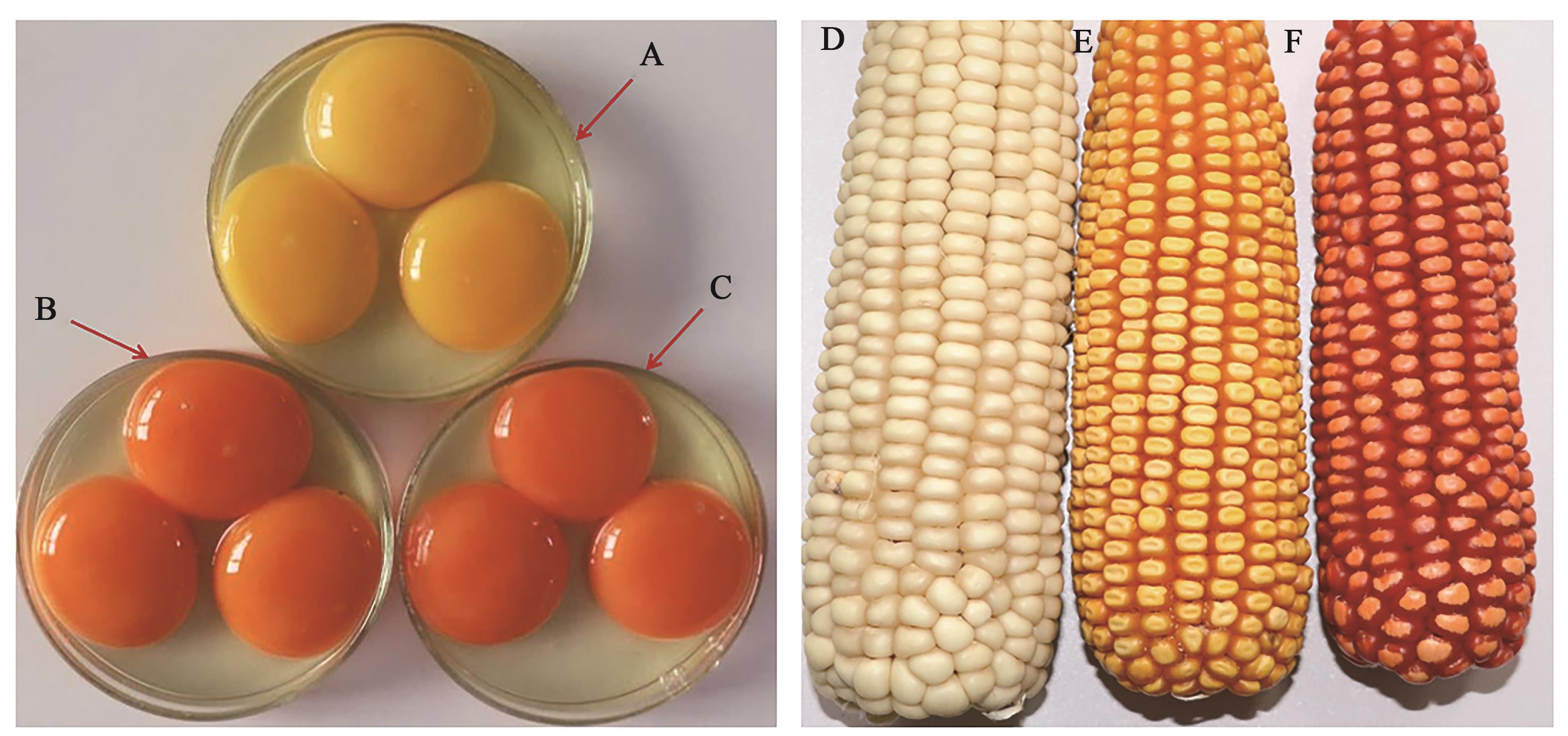 Fig. 3 Astaxanthin corn and eggs from laying hensA: Eggs from hens fed with the common layer feed; B: Eggs from hens fed with the feed added Haematococcus pluvialis algae powder; C: Eggs from hens fed with high astaxanthin corn; D: White corn; E: Yellow corn; F: Transgenic maize with high level of astaxanthin