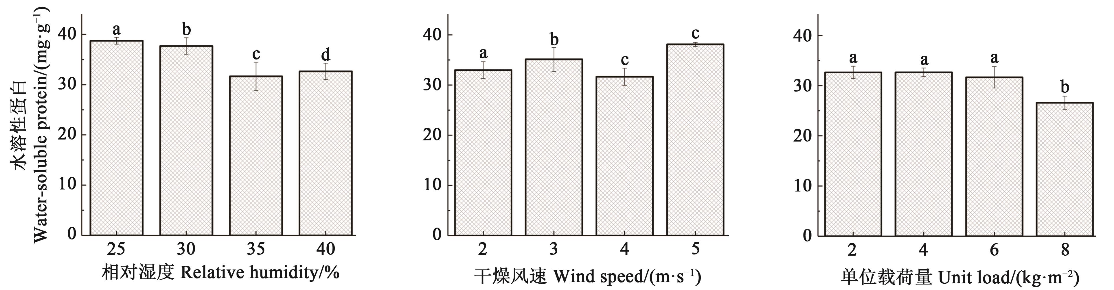 Fig. 2 Water-soluble protein content of Lentinus edodes under different drying parametersNote:Different small letters in the figure indicate significant differences at P<0.05 level.