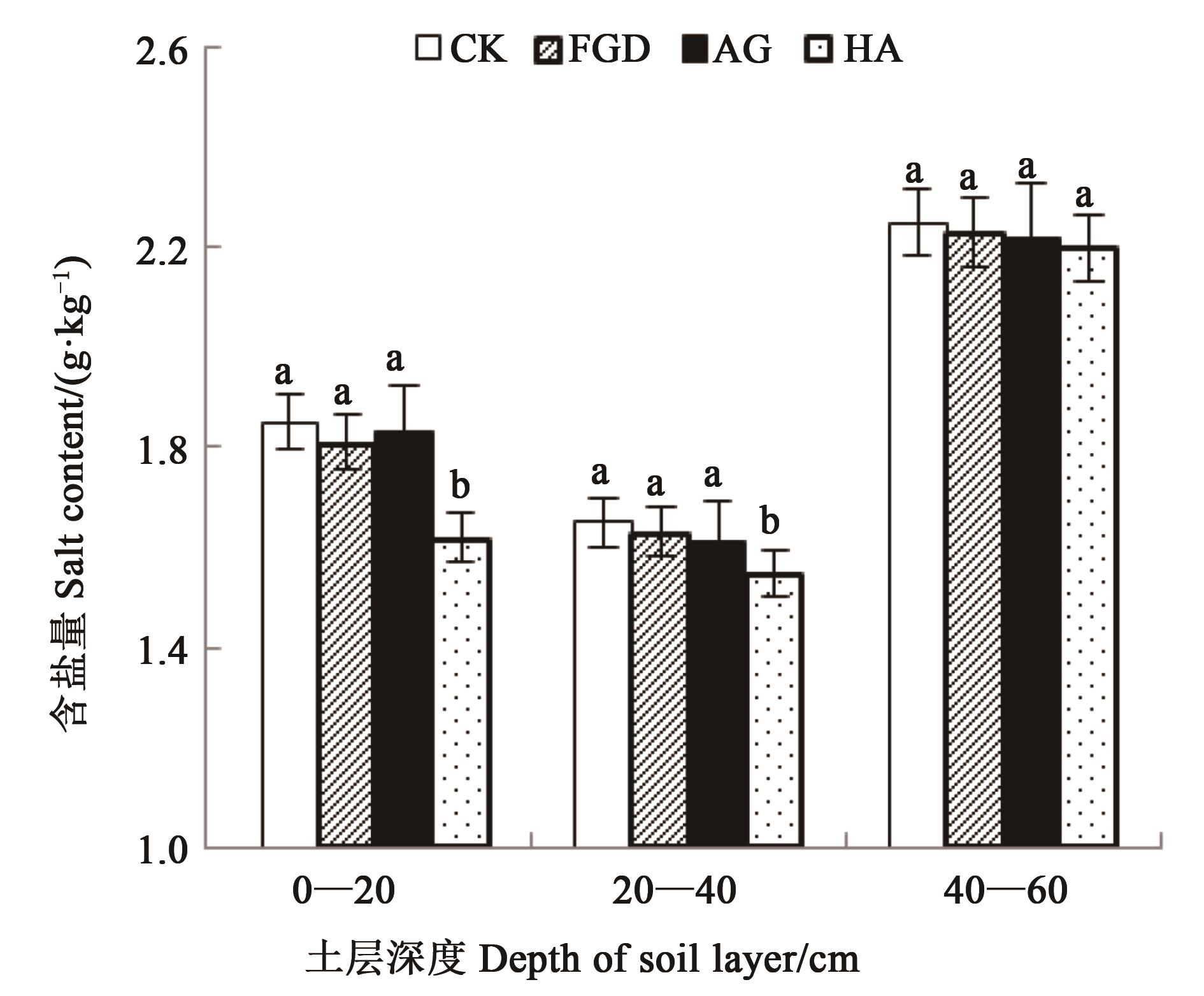 Fig. 1 Soil salt content in 0—60 cm soil layer under different soil amendmentsNote:Different lowercase letters in same soil layer indicate significant differences between treatments at P<0.05 level.