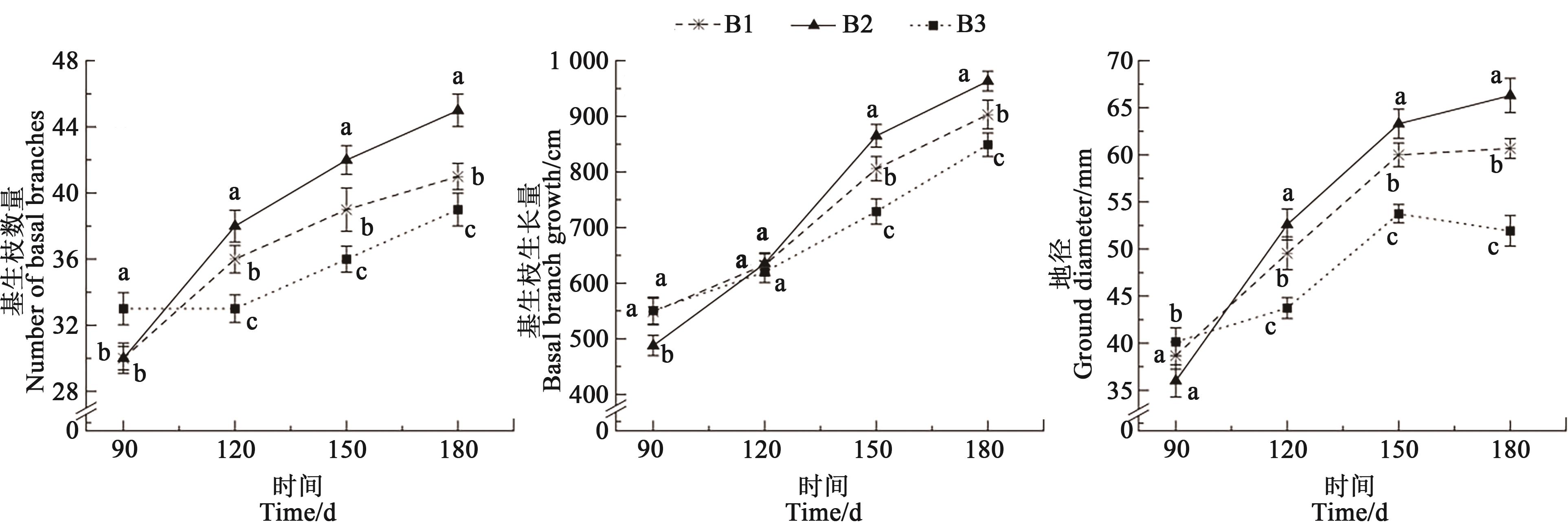 Fig. 1 Basal branch number,basal branch growth and ground diameter of blueberry under different iron environmentsNote: Different lowercase letters indicate significant differences between different iron treatments at the same incubation time at P<0.05 level.