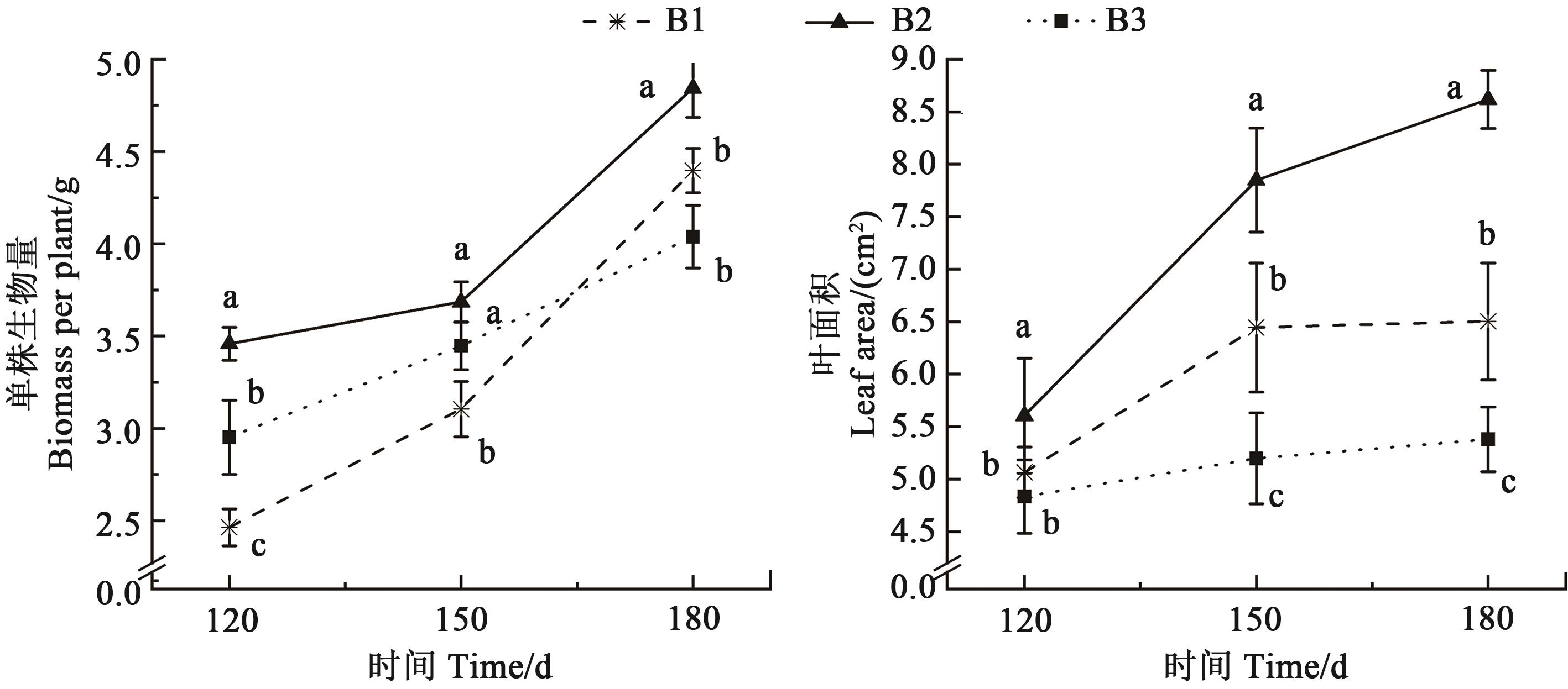 Fig. 2 Average weight per plant and mean leaf area of blueberry under different iron environmentsNote: Different lowercase letters indicate significant differences between different iron treatments at the same incubation time at P<0.05 level.