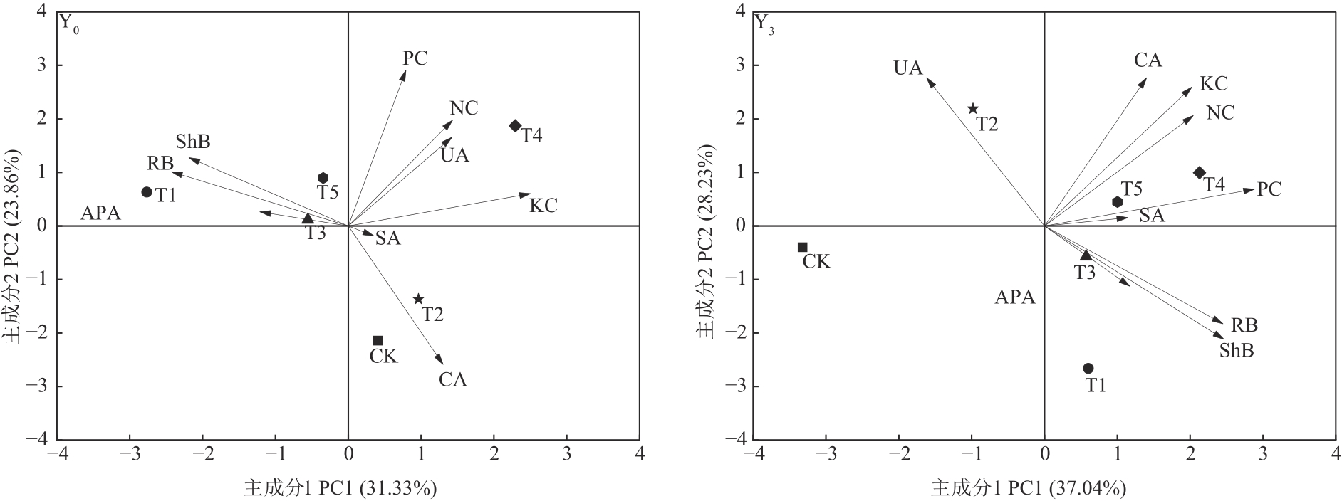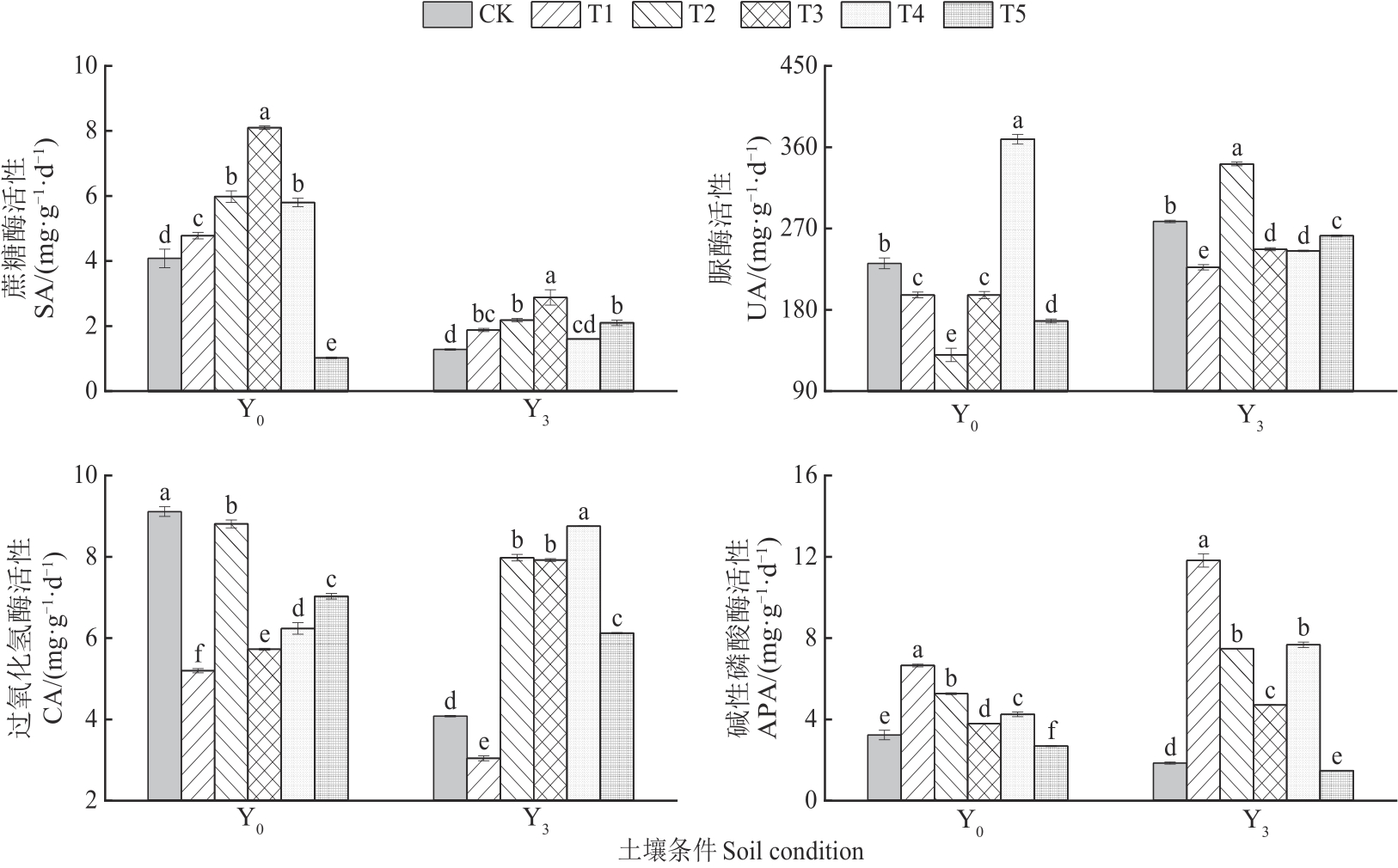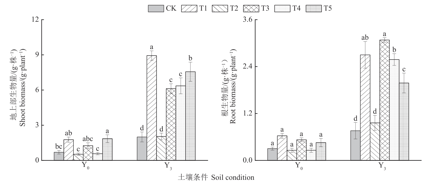 为探究不同土壤改良物料对连作土壤酶活性和黄芩生长的影响,采用室内盆栽试验,设置不添加改良物料(CK)和分别添加生物炭(T1)、腐殖酸(T2)、腐殖酸+生物炭(T3)、蚯蚓粪(T4)、蚯蚓粪+生物炭(T5)共6个处理,对未种植黄芩(Y0)和连作黄芩3年(Y3)2种土壤的黄芩农艺指标及土壤酶活性进行比较。结果表明,Y0条件下,仅T5处理的黄芩地上部生物量显著大于CK,并且5种土壤改良处理的黄芩根部生物量与CK均无显著差异;Y3条件下,除T2处理外其他处理的黄芩地上部、根部生物量较CK均显著提升。2种土壤条件下,T5处理对黄芩总氮含量的提升效果最好,T4处理对磷和钾含量的提升效果最好;T3处理下土壤蔗糖酶活性增幅最大,T1处理下碱性磷酸酶活性增幅最大。Y0条件下,T4处理的脲酶活性较CK显著提升,各处理的过氧化氢酶活性均显著降低;Y3条件下,仅T2处理的脲酶活性显著提升,T1处理的过氧化氢酶活性显著降低。Y0条件下,黄芩氮磷钾含量主要与蔗糖酶、脲酶活性显著相关;而Y3条件下的黄芩氮磷钾含量主要与脲酶、过氧化氢酶活性显著相关;同时,Y3条件下T5处理与黄芩氮磷钾含量、土壤蔗糖酶活性相关性更强。综上所述,T1、T5处理均可提升Y3条件下黄芩的生物量和氮磷钾含量,同时添加生物炭对连作土壤酶活性均有显著影响;T5处理对缓解黄芩多年连作障碍有显著效果。以上研究结果为缓解黄芩连作障碍、提升黄芩质量提供了理论依据。