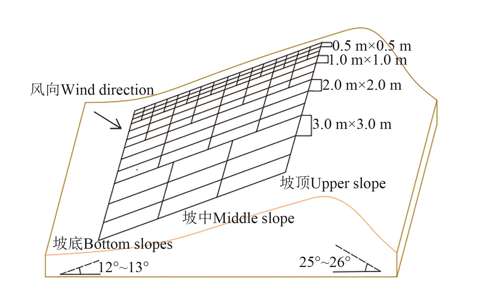 沙障的蚀积特征对其发挥防护作用具有重要影响。为探究聚乳酸纤维(polylactic acid fiber,PLA)沙袋沙障对乌珠穆沁沙地沙化治理的效果,设置0.5 m×0.5 m、1.0 m×1.0 m、2.0 m×2.0 m和3.0 m×3.0 m共4种规格的聚乳酸纤维沙袋沙障,采用悬测法测量障格内部凹曲面形态,并分析不同规格沙障内部凹曲面的形态特征、蚀积效应。结果表明,沙障凹曲面中心风蚀深度随沙障规格的增大由5.17 cm增加到21.23 cm,而堆积强度随沙障规格的增大由3.86 g·cm-3降至0.42 g·cm-3,障格内由堆积变为风蚀;蚀积系数稳定在1/9~1/8,随沙障规格的增大蚀积系数逐渐减小;障格内风蚀最深点随主风向偏移,障格内与主风向一致的方位风蚀量更大,剖面曲线开口更大;坡顶处凹曲面拟合效果大于坡中和坡底。综上所述,在乌珠穆沁沙地内,风蚀多发生在西北-东南和西-东方向上,且坡顶处形成的凹曲面较稳定,该地区适合布设2.0 m×2.0 m规格PLA沙障,研究结果为PLA沙障在乌珠穆沁沙地防沙工程中的合理应用提供了科学参考。