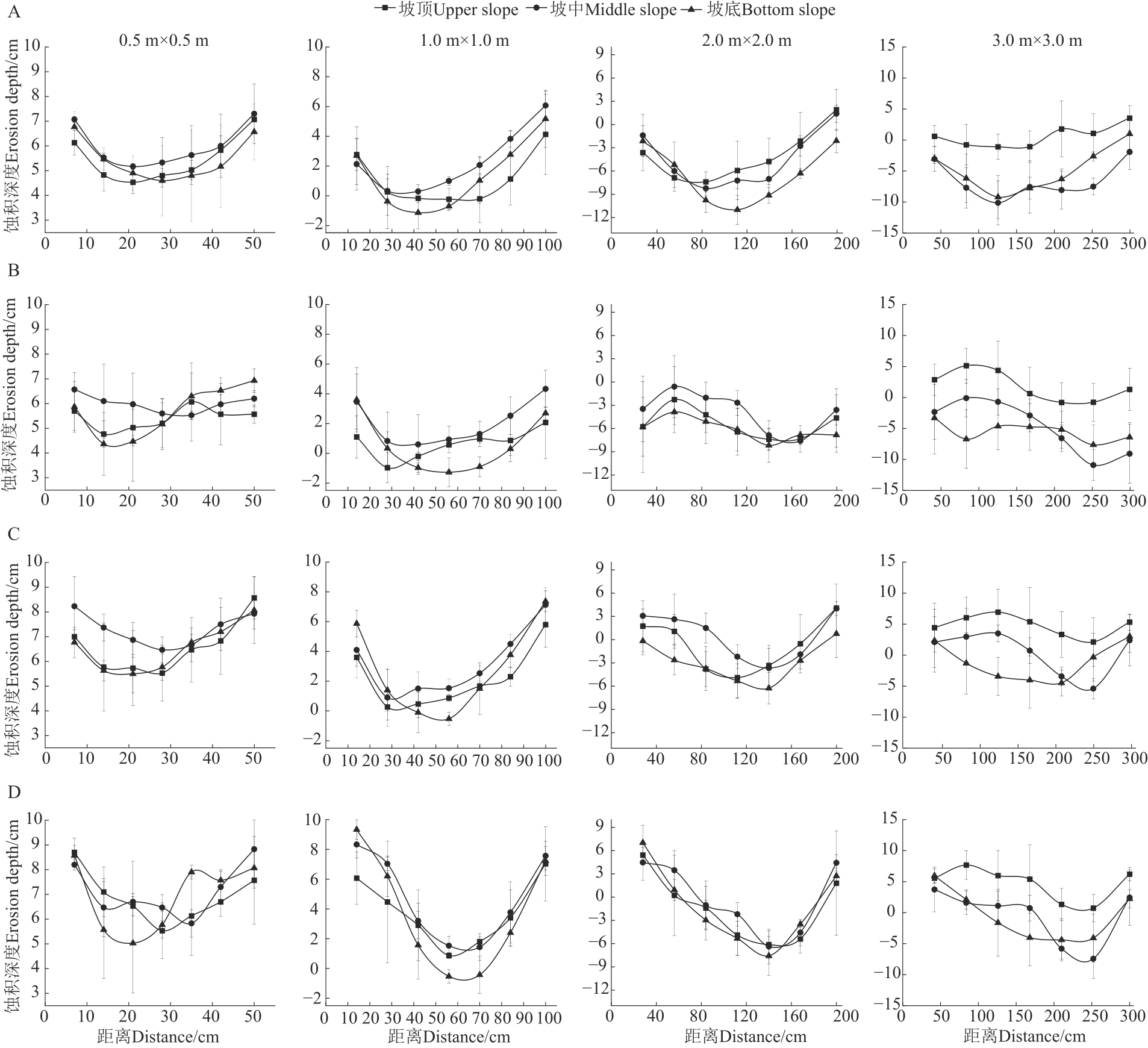 The erosion characteristics of sand barrier have important influence on its protective effect. In order to explore the effect of polylactic acid fiber (PLA) sandbag sand barriers on desertification control in Urumqi sandy land, four specifications of poly lactic acid fiber sandbag sand barriers were set with 0.5 m×0.5 m, 1.0 m×1.0 m, 2.0 m×2.0 m and 3.0 m×3.0 m. The concave surface shape inside the baffle was measured by suspension method. The morphological characteristics and erosion effect of concave surface in different specifications of sand barriers were analyzed. The results showed the wind erosion depth at the center of the concave surface of the sand barrier increaseed from 5.17 cm to 21.23 cm with the increase of the sand barrier specifications, and the stacking strength decreased from 3.86 g·cm-3 to 0.42 g·cm-3 with the increase of sand barrier size, which the accumulation turned to wind erosion in the barrier. The erosion coefficient was stable at 1/9~1/8, and decreased with the increase of sand barrier size. The deepest point of wind erosion in the barrier moved with the main wind direction. The wind erosion in the direction consistent with the main wind direction was greater, and the opening of the profile curve was larger. The concave surface fitting effect at the top of the slope was better than that at the middle and bottom of the slope. In summary, In Urumqi sandy land, wind erosion occurred mostly in northwest-southeast and west-east directions, the concave surface formed at the top of the slope was more stable, and the area should be suitable for laying 2.0 m×2.0 m PLA sand barriers. Above results could provide scientific reference for the rational application of PLA sand barriers in sand control project in Urumqi sandy land.