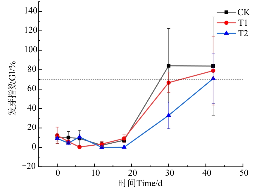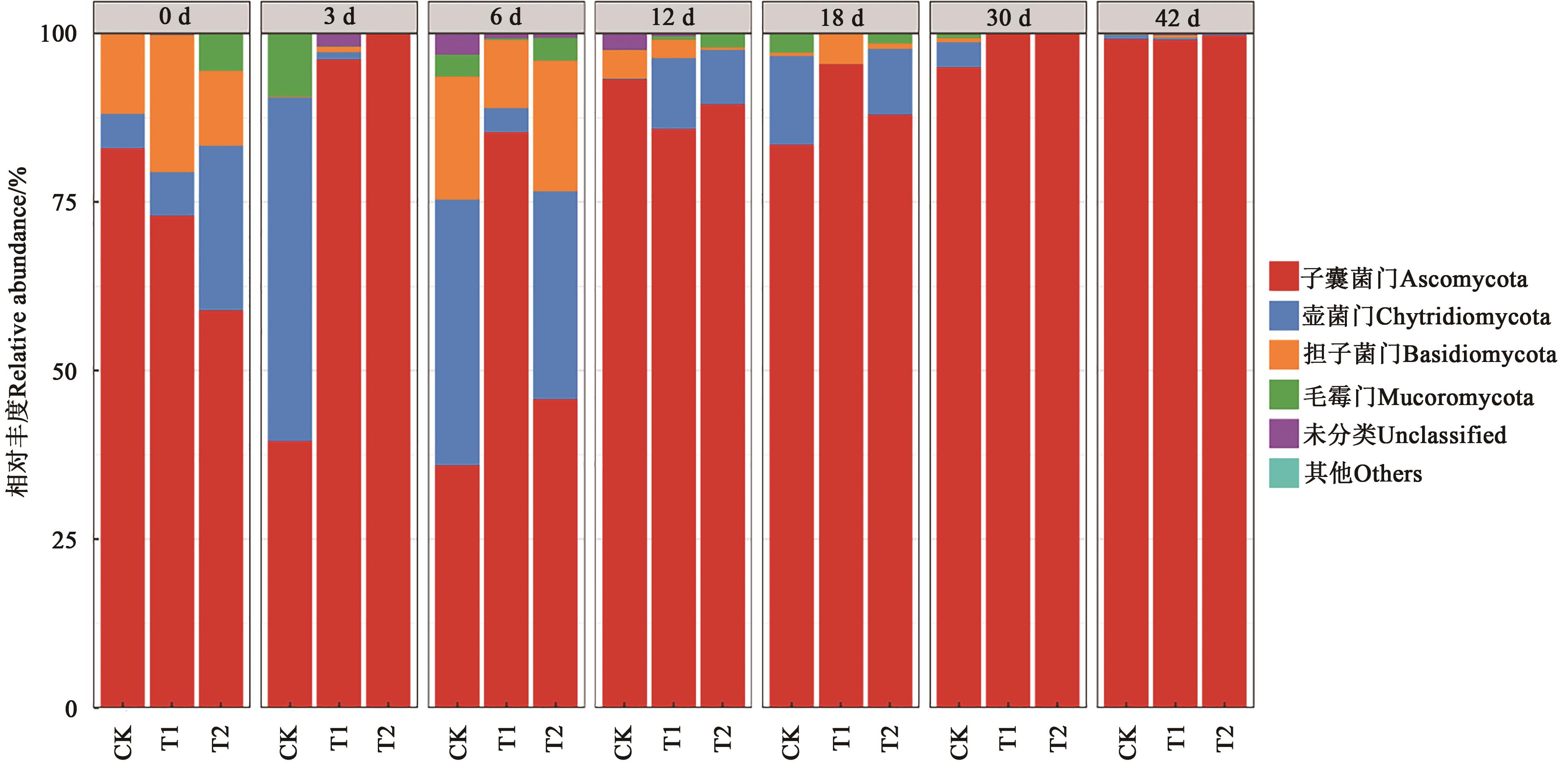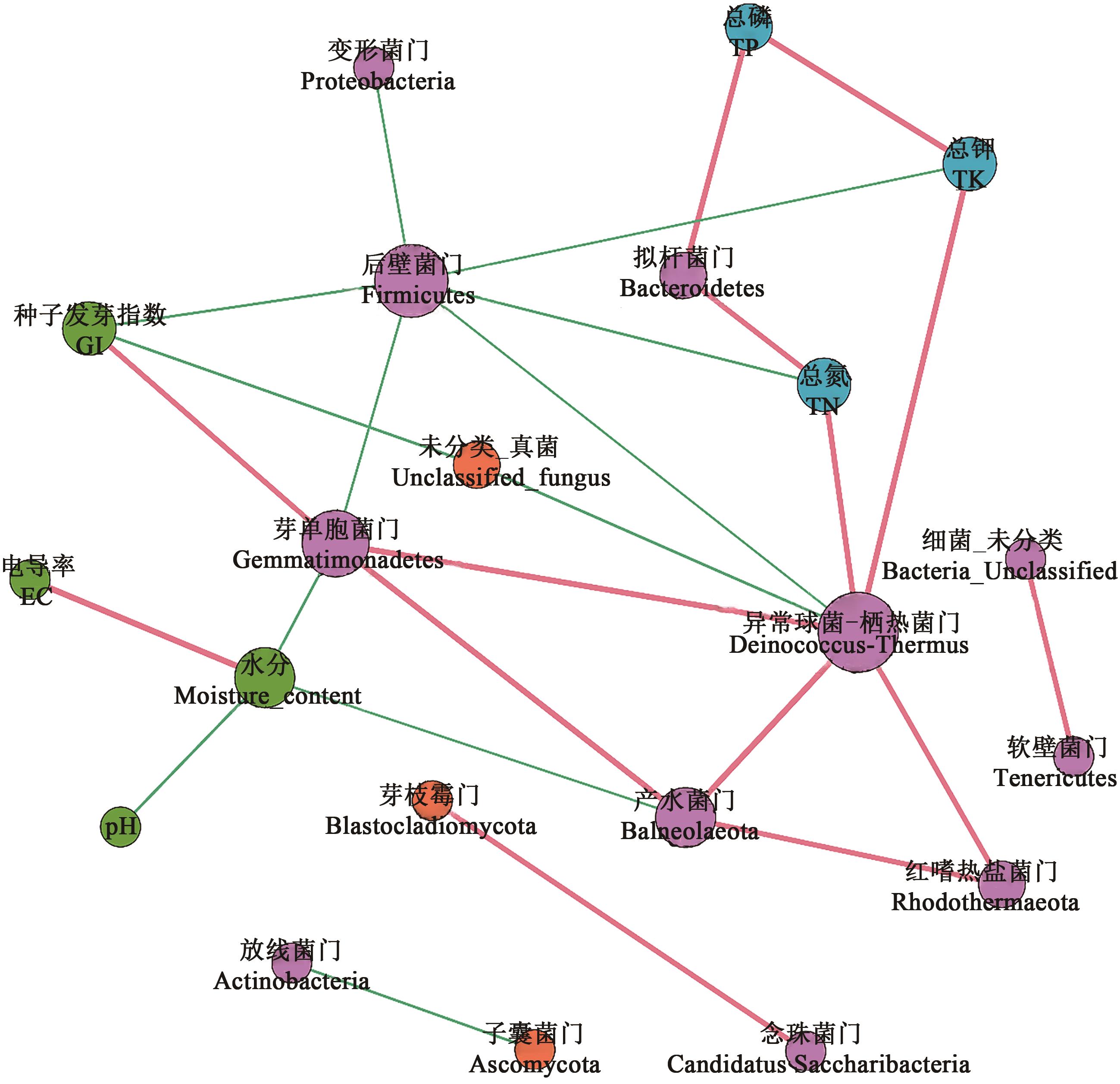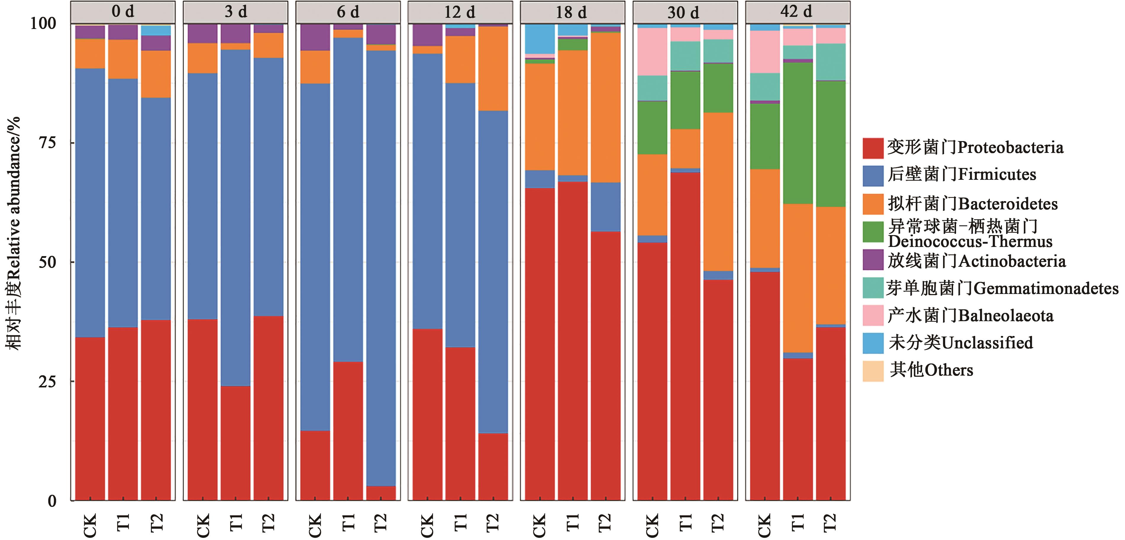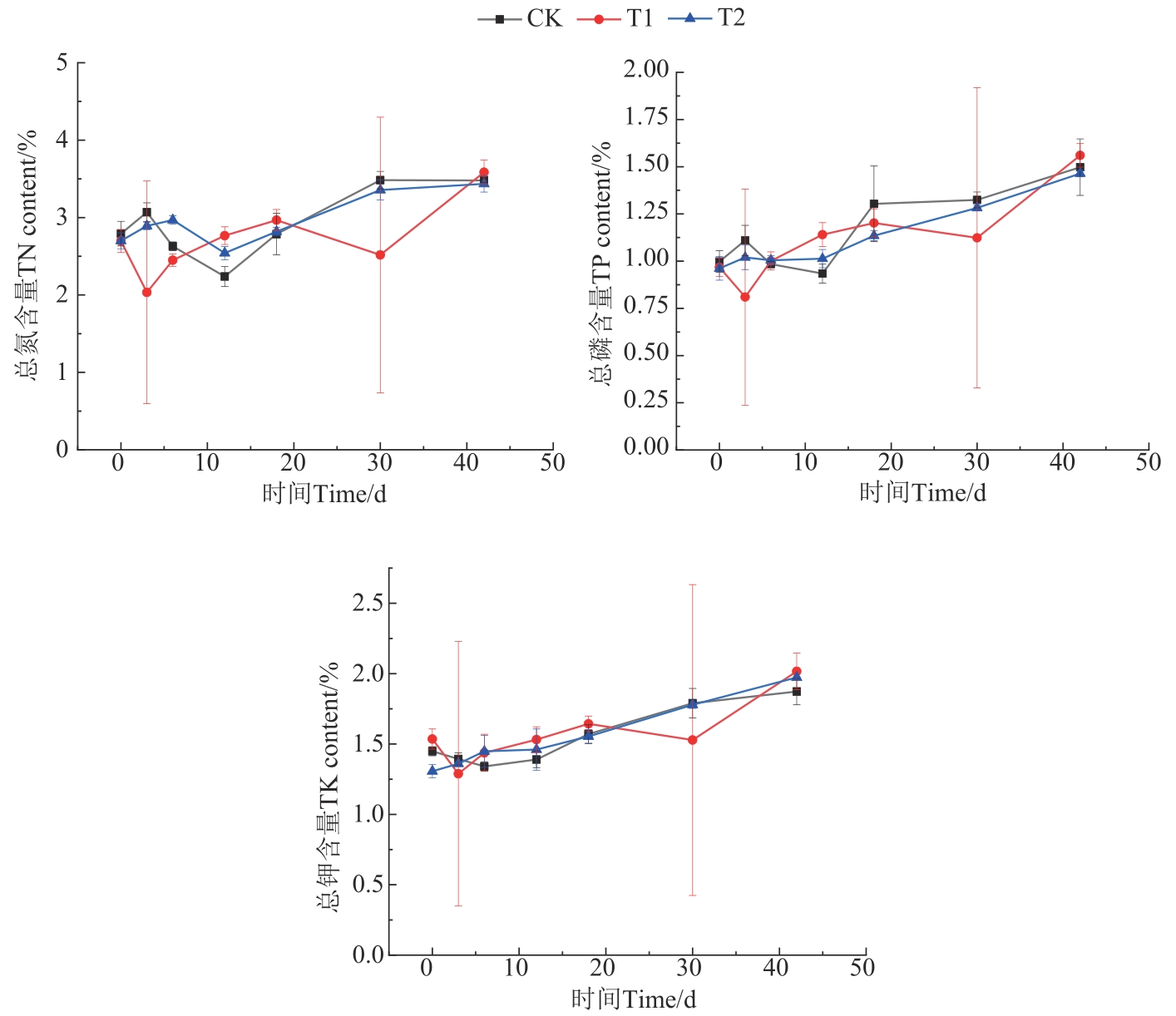 为探讨不同来源微生物对葡萄枝条猪粪共堆肥过程的影响,以不添加外源微生物为对照(CK),分别设置接种沼液(T1)和微生物菌剂(T2)处理,分析不同处理堆肥过程中的堆体温度、水分、pH、电导率、总氮磷钾含量、种子发芽指数及细菌和真菌群落的变化情况,以确定堆肥过程中的关键微生物种类。结果表明,T1处理在第3天时堆体温度已超过45 ℃,较T2处理前期升温更快,3种处理的最高堆体温度均达到60 ℃。各处理堆肥的水分、pH、电导率和养分含量变化一致,总氮、总磷、总钾含量分别为3.43%~3.59%、1.46%~1.56%、1.87%~2.02%,其中,T2处理发酵结束后,堆肥的水分、pH和电导率较其他处理更高。堆肥过程中,CK和T1处理第30天物料的种子发芽指数超过70%,较T2处理更快地达到有机肥料标准。微生物群落分析表明,各处理堆肥发酵前期变形杆菌门和厚壁菌门的相对丰度超过75%;发酵中期厚壁菌门为优势菌群;发酵中后期拟杆菌门和异常球菌-栖热菌门的相对丰度上升,最终占比均超过20%。相关分析表明,厚壁菌门、拟杆菌门和异常球菌-栖热菌门3种细菌门类与堆肥各项指标呈显著相关。贡献度分析表明,微生物群落对堆肥的总贡献度为33.90%, 其中芽单胞菌门的贡献度达80.80%。以上研究结果为进一步研究筛选专用型耐受抗氧化物的发酵菌剂提供了参考依据。