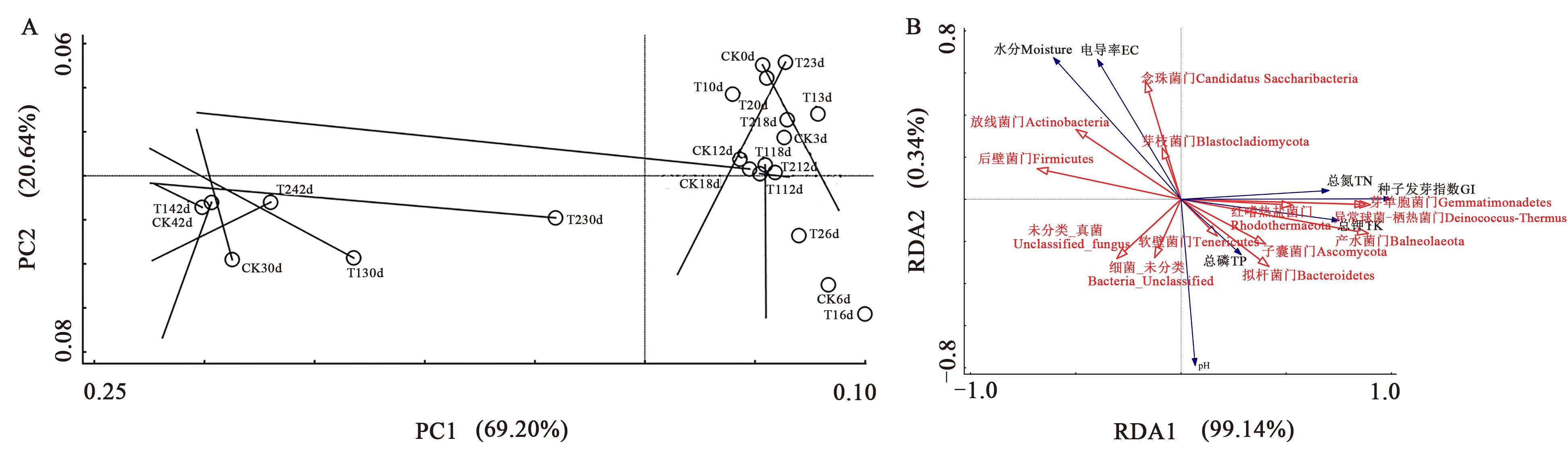 关键词: 葡萄枝条, 微生物菌剂, 沼液, 堆肥, 微生物群落