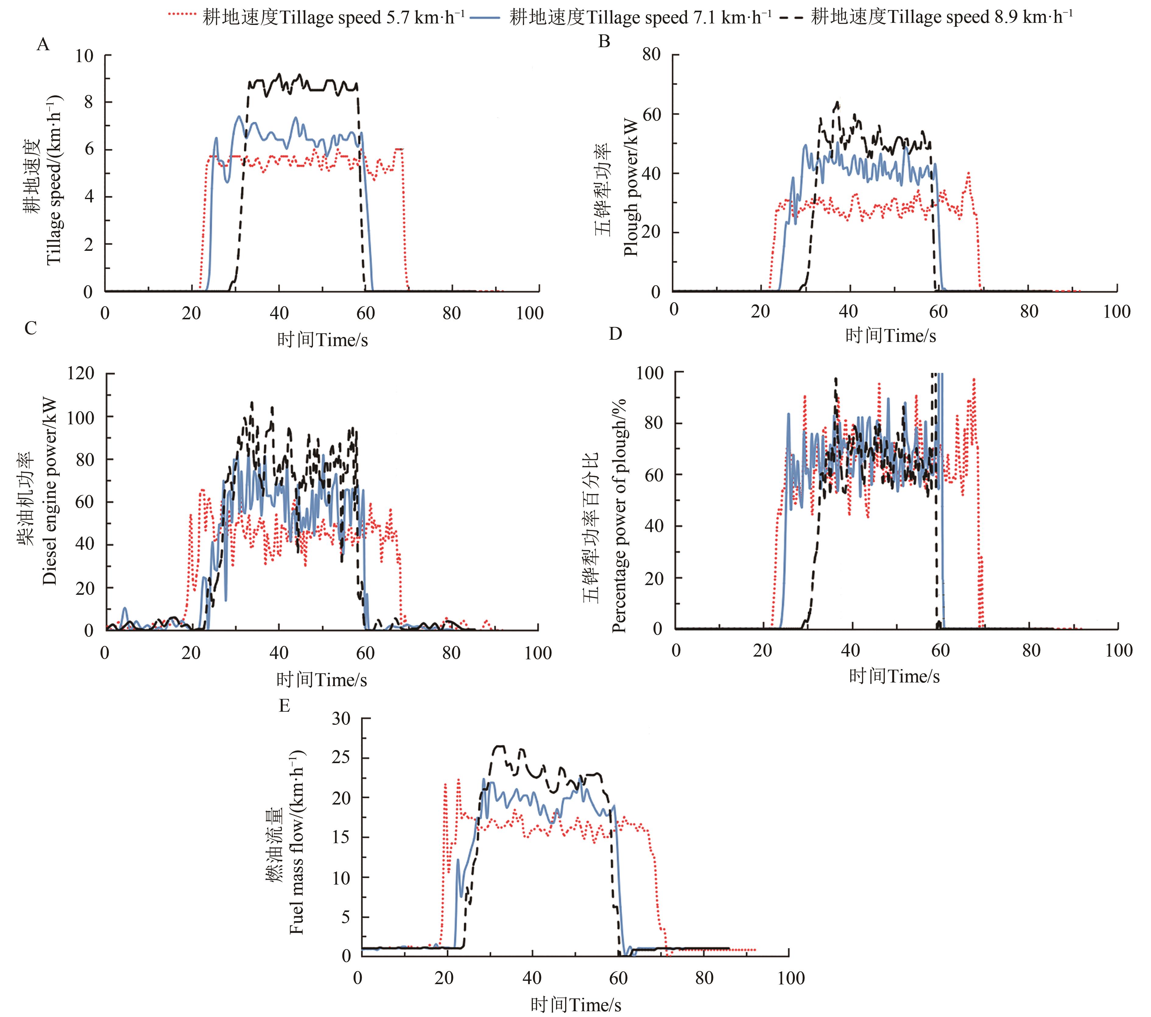 Fig. 3 Test results of different tillage speed of the plough agricultural machineryA:Tillage speed; B:Five-furrow plough power; C:Diesel engine power; D: Five-furrow plough power accounts for the percentage of the diesel engine power; E:Fuel consumption of the plough agricultural machinery