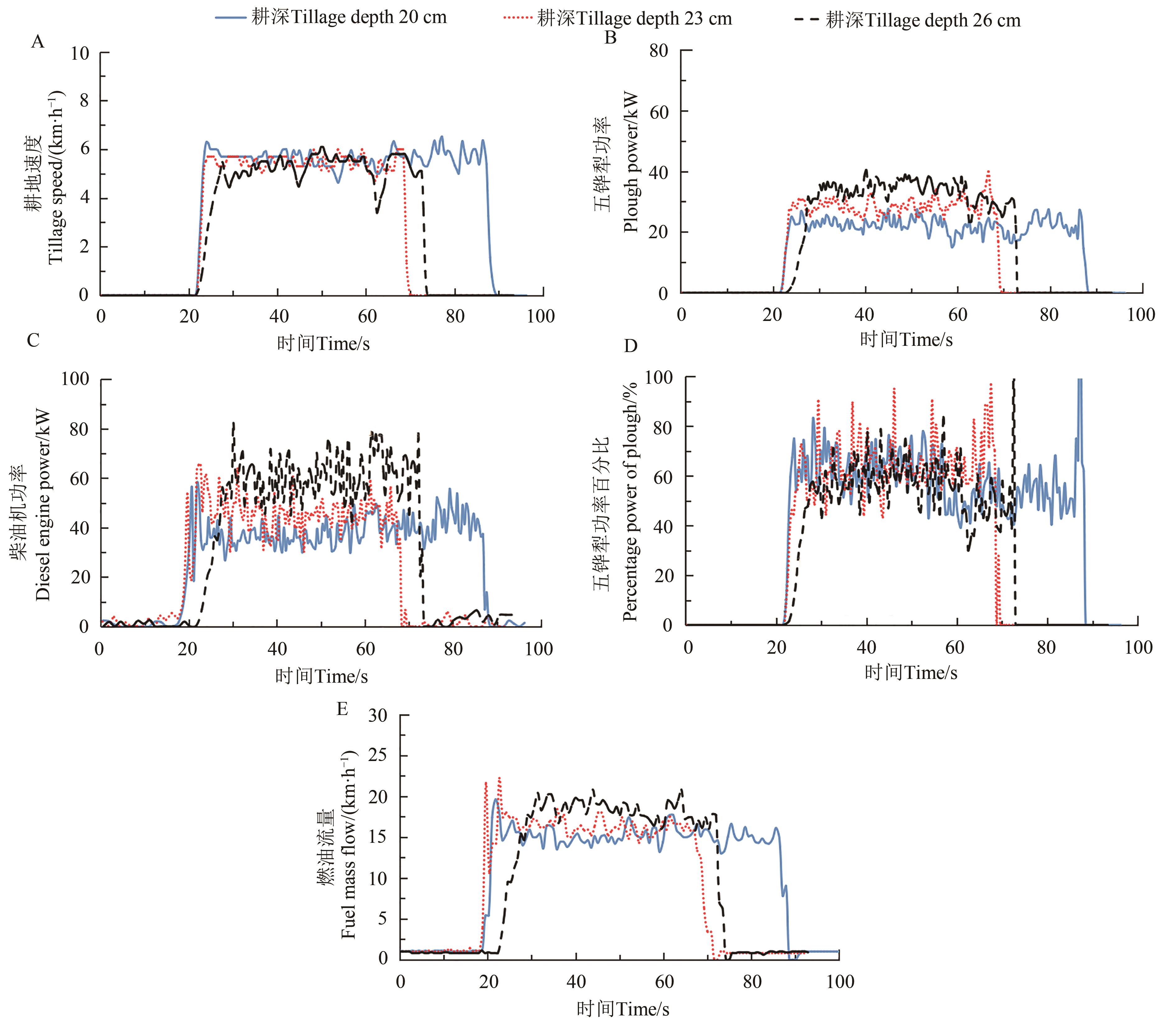 Fig. 4 Test results of different tillage depth of the plough agricultural machineryA:Tillage speed; B:Five-furrow plough power; C:Diesel engine power; D: Five-furrow plough power accounts for the percentage of the diesel engine power; E:Fuel consumption of the plough agricultural machinery