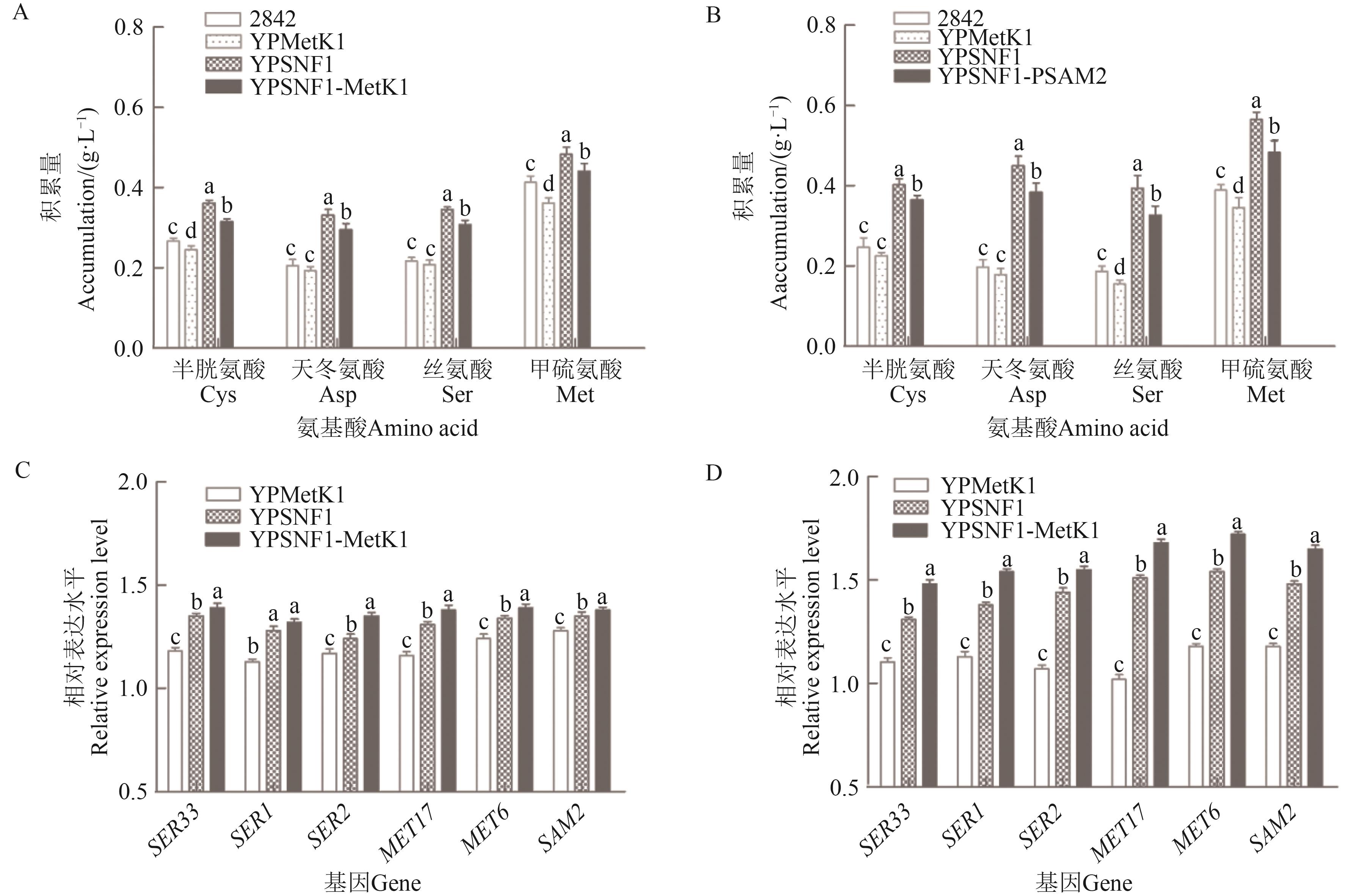 Fig. 5 Effects of SNF1 and MetK1 overexpression on precursor amino acid metabolism of yeast A~B: Precursor amino acids accumulations of strains in 5% and 10% glucose, respectively; C~D: Relative expression levels of genes related to amino acid metabolism of strains in 5% and 10% glucose, respectively; different lowercase letters indicate significant differences between different strains at P<0.05 level |