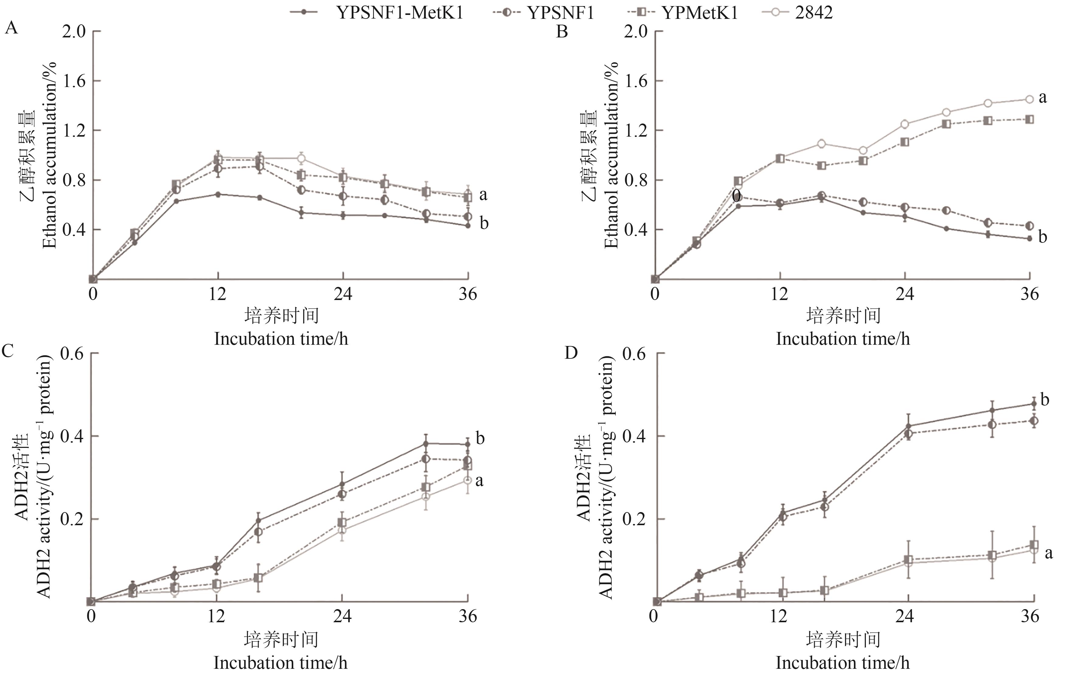 | Fig. 6 Effects of SNF1 and MetK1 overexpression on ethanol metabolism of yeast A~B: Ethanol accumulation in 5% and 10% glucose, respectively; C~D: ADH2 activities in 5% and 10% glucose, respectively |
