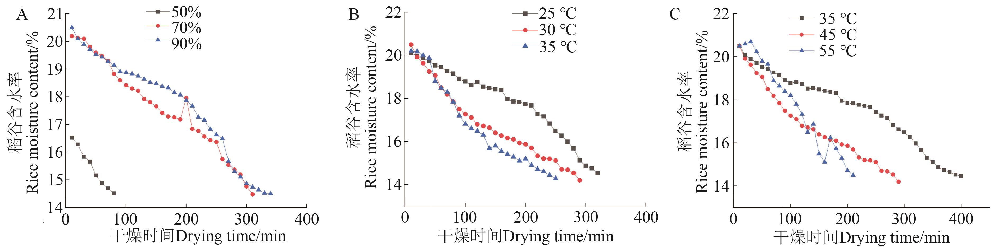 | 图4 不同环境相对湿度、粮层温度、热风温度处理下的稻谷含水率 A:环境相对湿度;B:粮层温度;C:热风温度 |